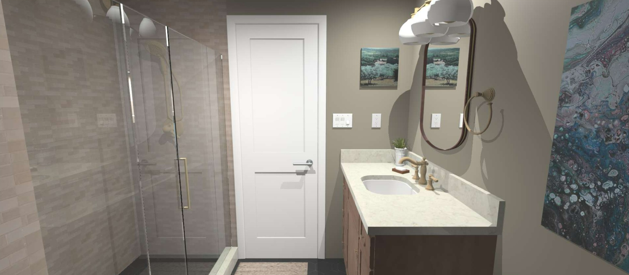 convert this image into a photorealistic architectural rendering using the source image as locked reference geometry preserve the exact composition layout camera position materials colors fixtures tile patterns and object placement do not modify the design in any way lighting conditions this room has no windows and no natural sunlight the space is illuminated only by the artificial lighting fixtures present in the design as wall sconces flanking the mirror and recessed lighting in the ceiling the lighting should appear realistic and natural for interior artificial lighting with soft shadows and balanced illumination maintain the intended lighting temperature and fixture effects recessed lights sconces pendants etc exactly as shown in the design strict constraints do not add sunlight or daylight do not introduce windows or exterior light sources do not alter materials or colors do not add or remove objects treat the source image as fixed architecture