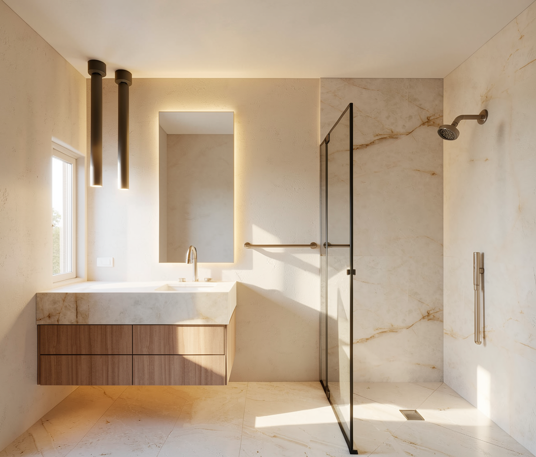 backlit mirror surrounding walls plaster floor is off white limestone natural day lighting