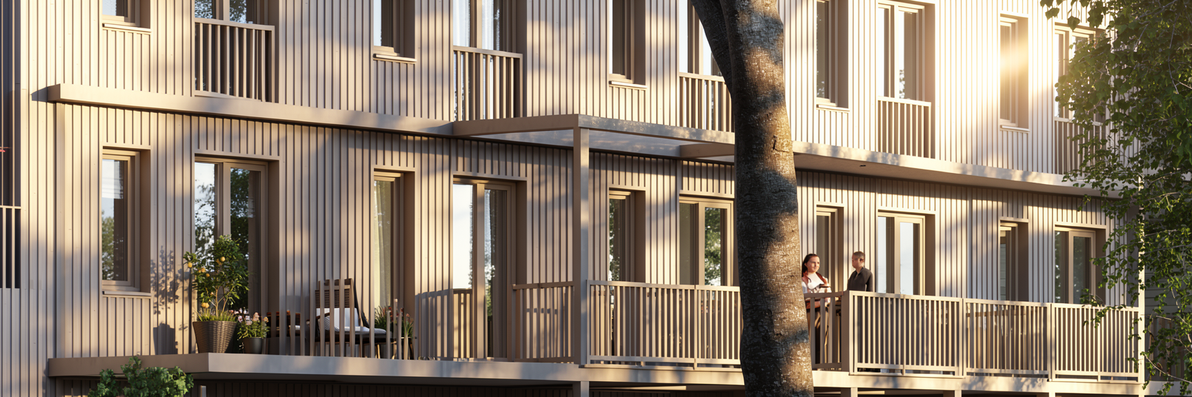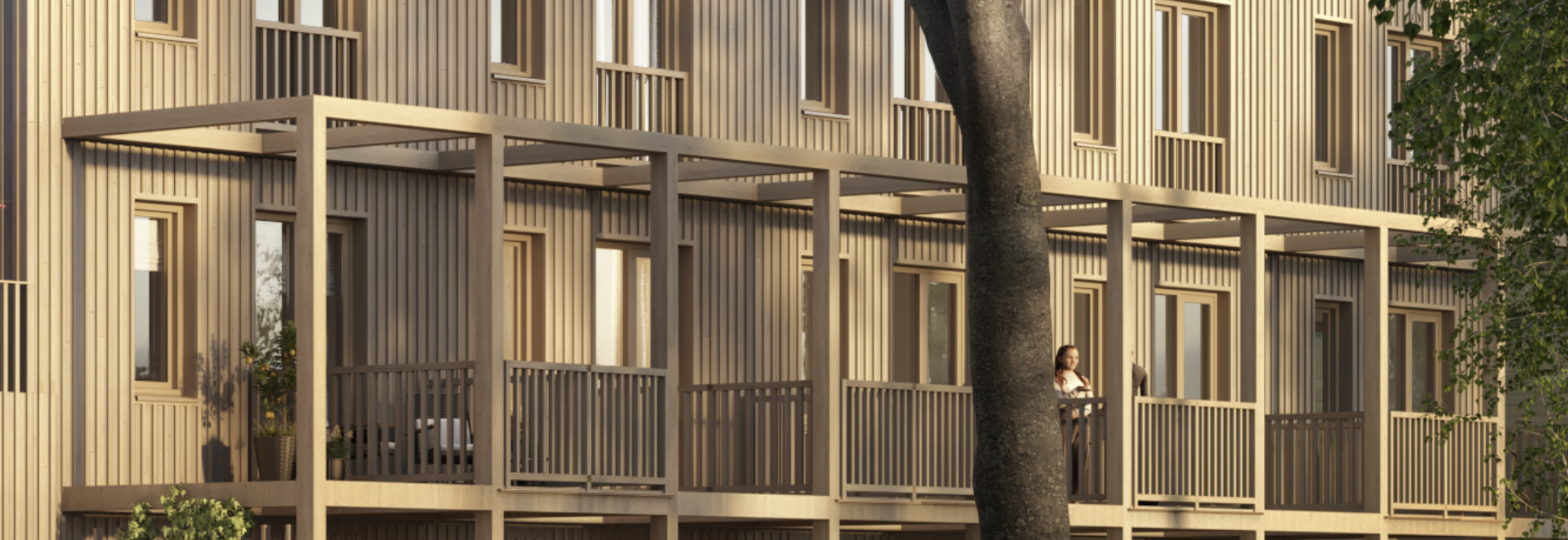 keep the lighting environment weather and time of day exactly as shown in the photo remove the wooden structure only on the second floor level as it represents a design change preserve the wooden structure on the first floor level do not alter any other elements including building form layout or camera angle