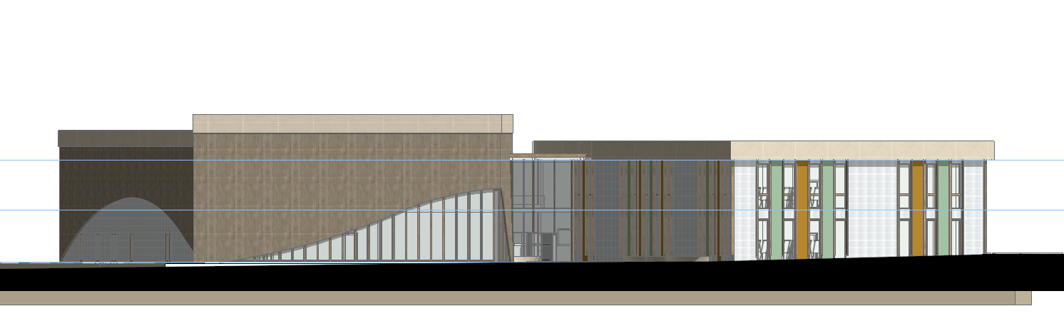 create a modern facade for an art school without changing the shape with wooden elements in the middle with glass without landscape with color elements