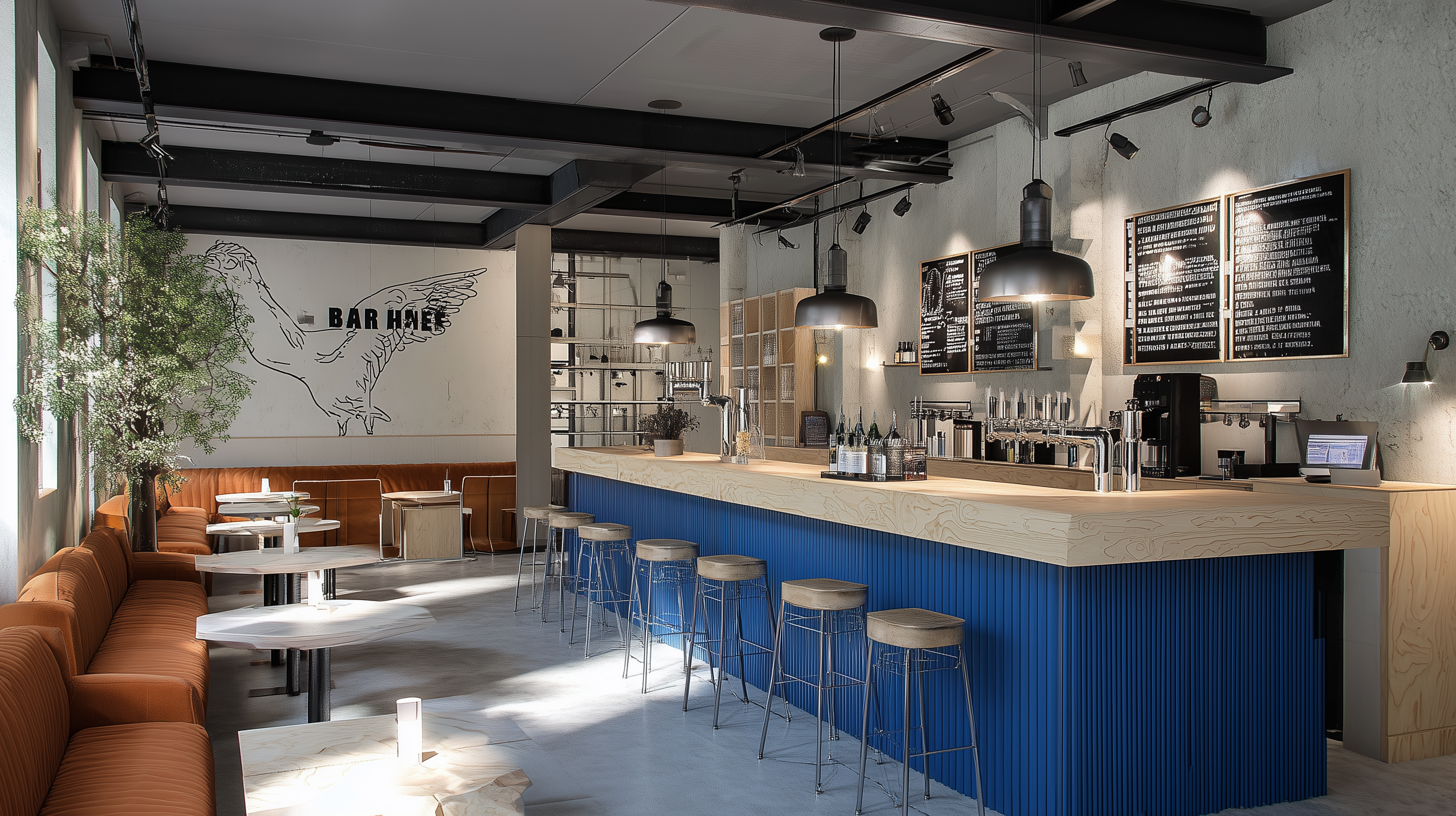 redesign this bar interior to match the brand identity of bar en hane a modern scandinavian beer bar with minimalist line art as its visual language keep the existing layout and bar counter but restyle the space with the following changes repaint the wooden bar front in a deep cobalt blue rich saturated high end while keeping the metal bar top add subtle stylish wall art in the form of thin single line drawings directly on the concrete walls a rooster outline and a beer tap outline elegant and graphic add indoor plants with warm lighting to create a more inviting cozy scandinavian atmosphere use color accents only in cobalt blue and burnt orange to match the brand keep the overall mood warm cozy modern industrial with scandinavian simplicity create a refined photorealistic render with a warm inviting look that matches the new brand personality minimal playful crisp line art identity feel free to propose additional styling ideas that enhance coziness and visual identity without moving the bar or changing the layout any additions must use the brand color palette cobalt blue burnt orange and match the scandinavian graphic line art concept