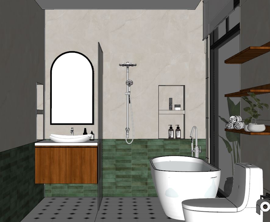 create ultra realistic images without changing any structure shape design or materials do not resize jpegs add indirect light to curtain valance and all around the mirror and add spotlight to ceiling and add soft outdoor light make the wall glossy and the floor is matte