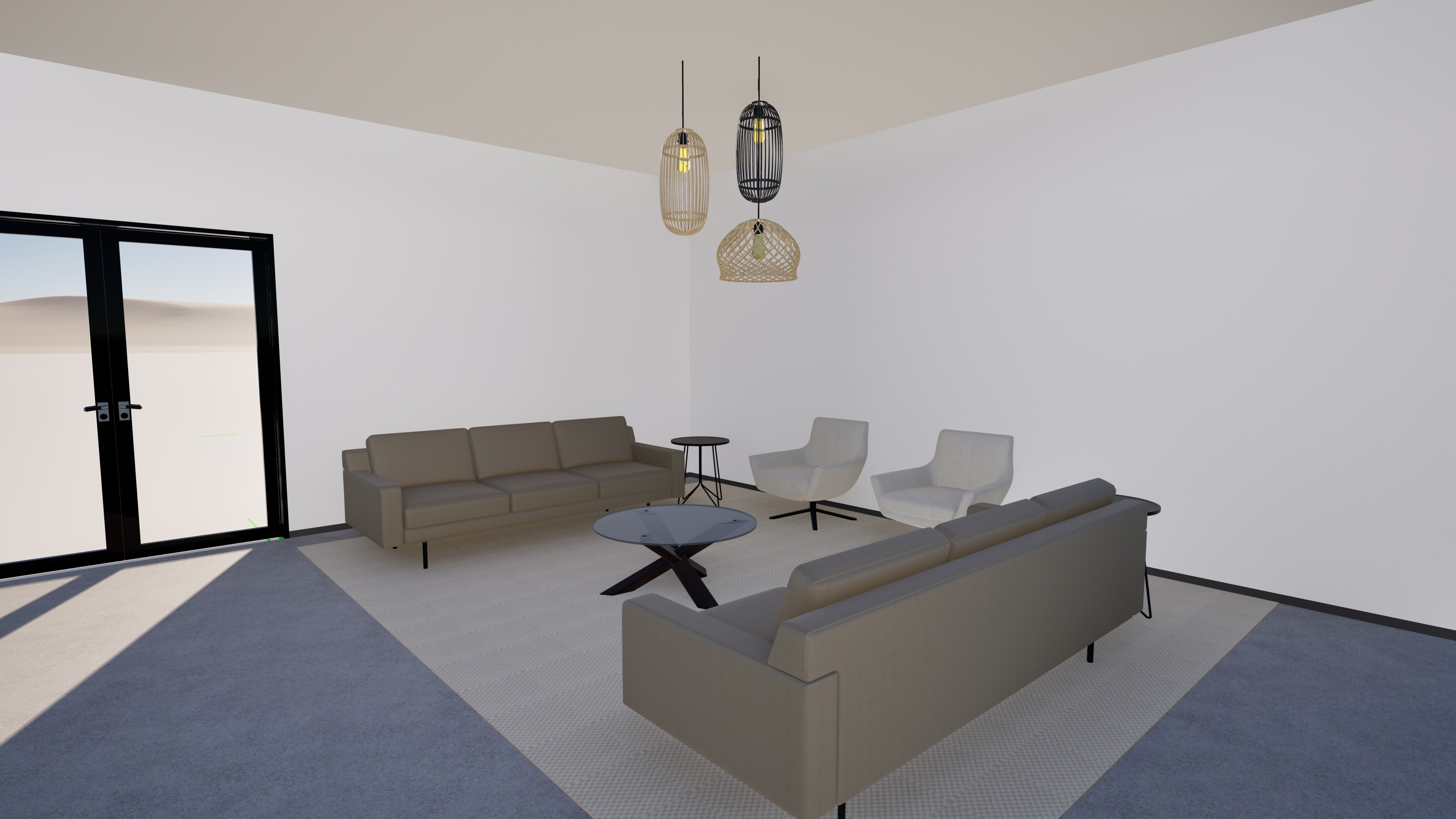 add decor make more realistic and add professional people do not change any of the furniture or materials add recessed lighting add artwork on the walls make view outside of a door a hallway