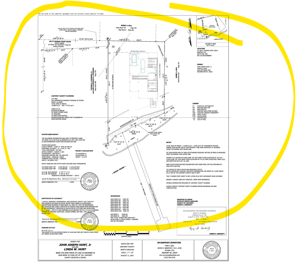 generate a landscaping plan from the plot plan focusing around the residence in circled in the yellow circle lush topicals flowering shrubs suited for coastal waters