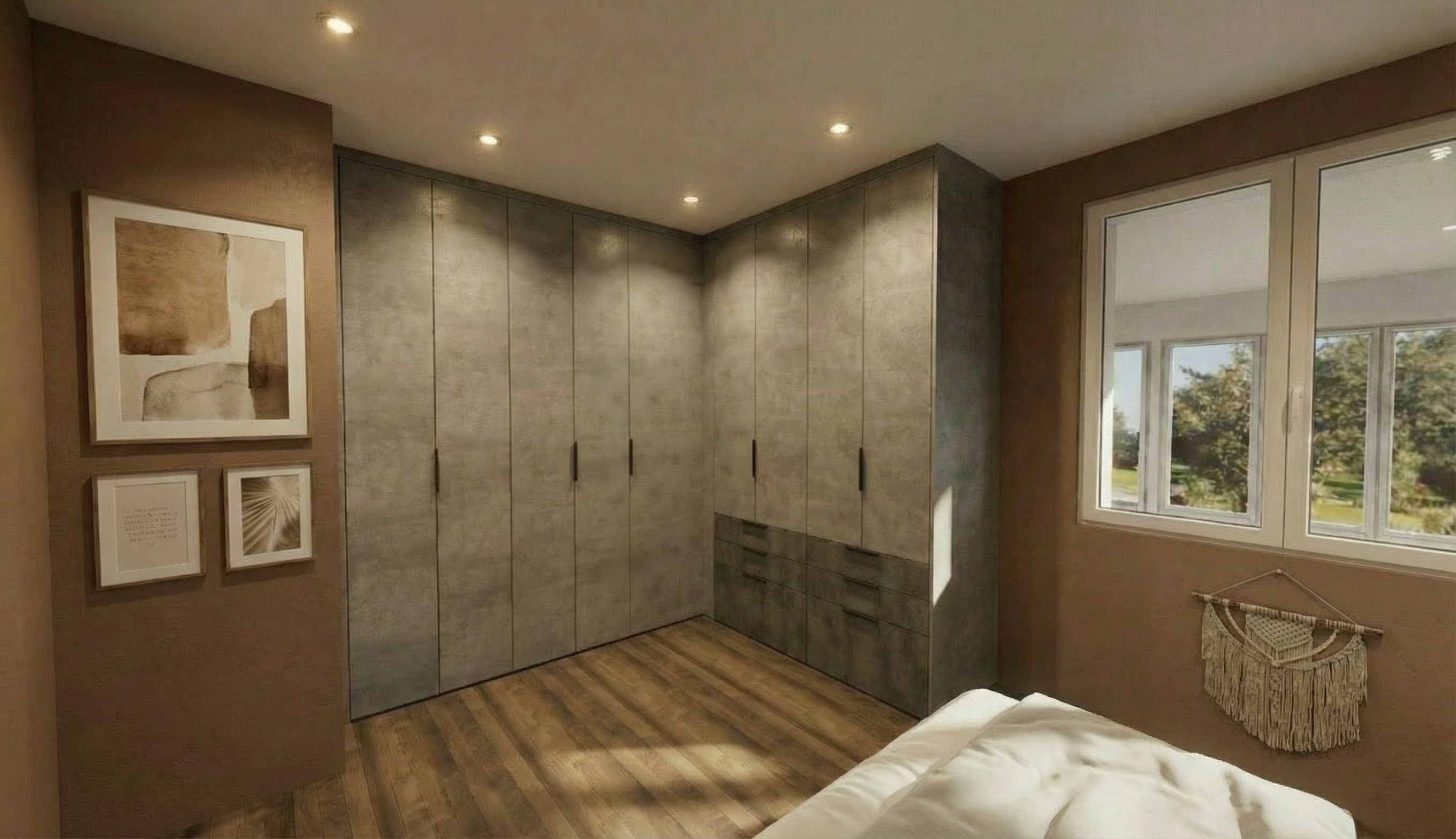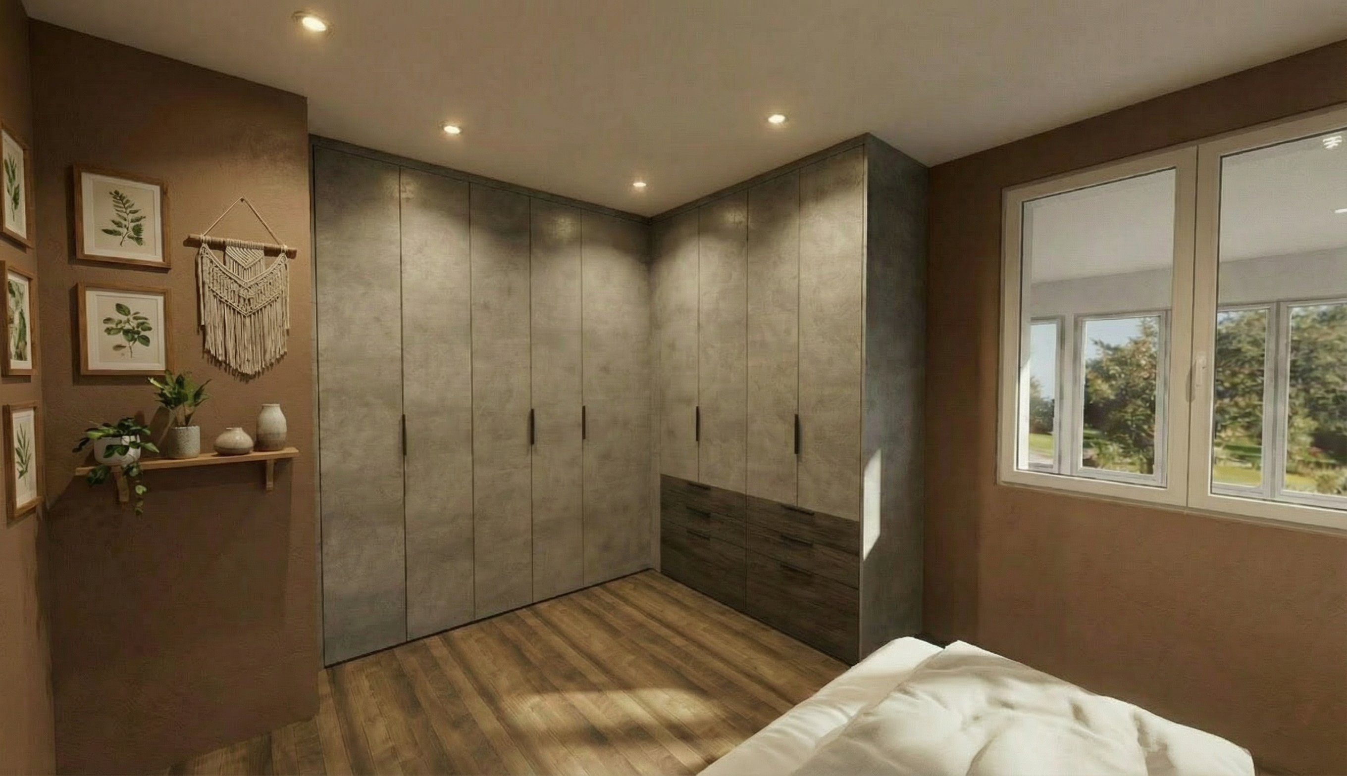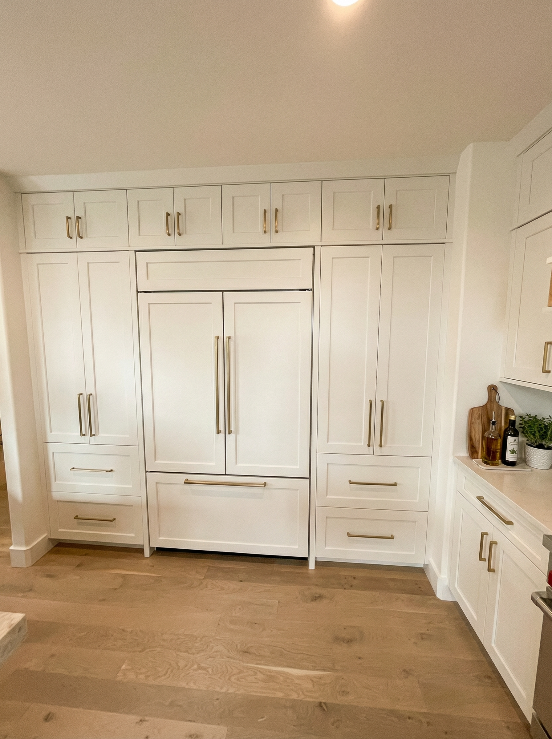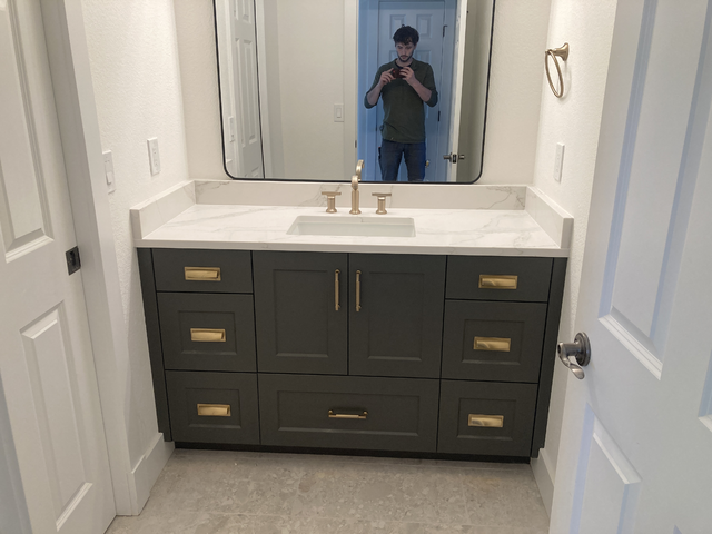 do not change the cabinets in any way preserve the exact cabinet colors materials finishes dimensions door and drawer styles hardware spacing alignment and all geometry exactly as shown do not alter the countertop shape backsplash appliances flooring lighting fixtures or wall structure only remove the construction materials clutter and mess from the scene clean the room and make it look finished and staged add a few simple tasteful home accessories appropriate for the style of the space but do not add or remove any furniture windows or architectural elements maintain the original lighting direction and realism enhance clarity and polish the photo while keeping the cabinetry and room design completely unchanged do not alter the lighting to keep the cabinet colors as they are in the image add gold bathroom accessories put a towel on the ring remove the reflection and the door on the right