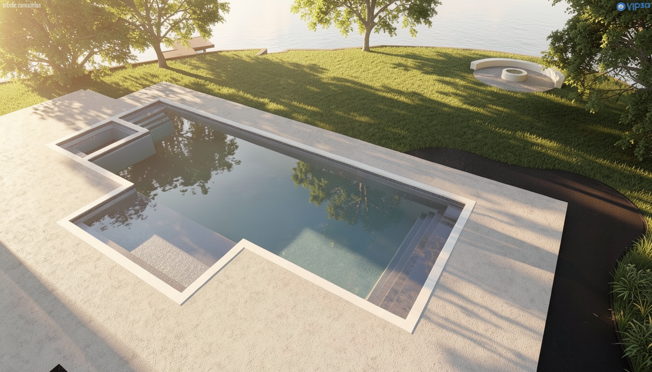 white limestone pool deck low 2 foot hedge behind pool lush evergreen landscaping on right side of image