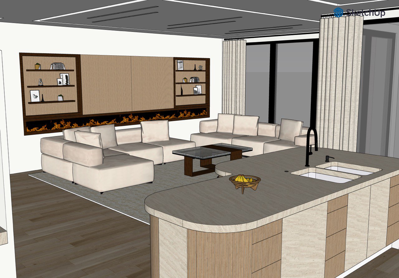 modern interior shot a modern living room connected to a kitchen area on the left there s a contemporary sofa set arranged in an l shape facing a coffee table behind the sofa is a long linear fireplace set into a textured wall with a mounted shelving unit above it displaying various decorative items the ceiling above is simple with recessed lighting large windows or glass doors are on the right side draped with heavy curtains suggesting access to an outdoor area or providing a view the flooring transitions from wooden planks in the seating area to what looks like tiles in the kitchen area the kitchen features a large island with a built in sink and a modern tall faucet on the island there s a fruit bowl and the countertop appears spacious possibly used as a bar or serving area the render shows a realistic room layout with a focus on a neutral color palette emphasizing browns beiges and greys architecture