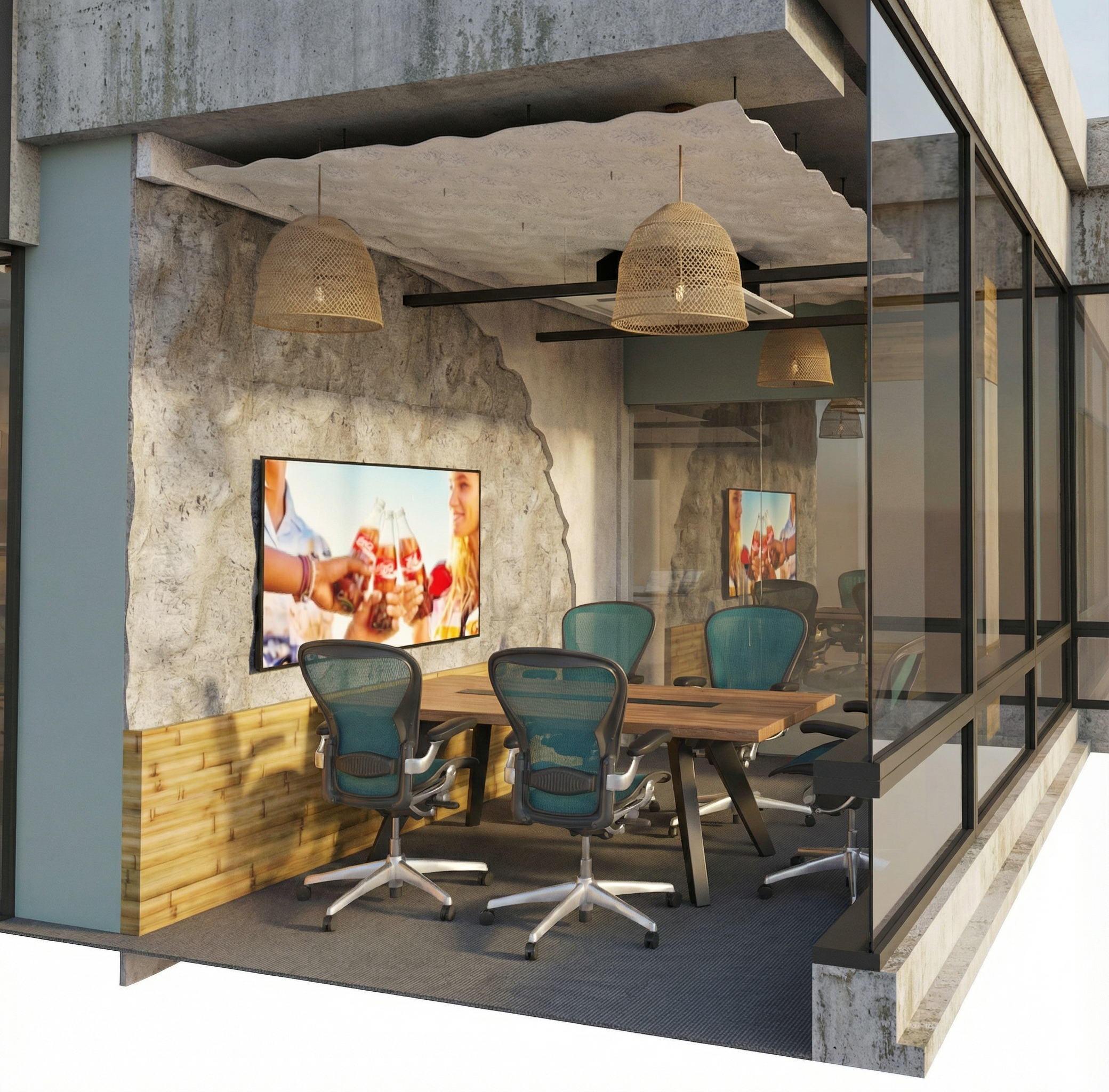 modern interior hallway with an elegant atmosphere deep burgundy walls and curved features create a warm and sophisticated environment smooth ivory marble wall contrasts beautifully with the rich colors complementing the matte black doors bronze wall sconces with glowing round bulbs add soft ambient lighting the concrete floor is subtle and light gray the celling is lighten up by led around the door on a left on a front wall are going to male changing room so paint the silhuette of male dancer on the burgundy front wall the overall atmosphere is luxurious and serene blending contemporary design with a touch of classic elegance