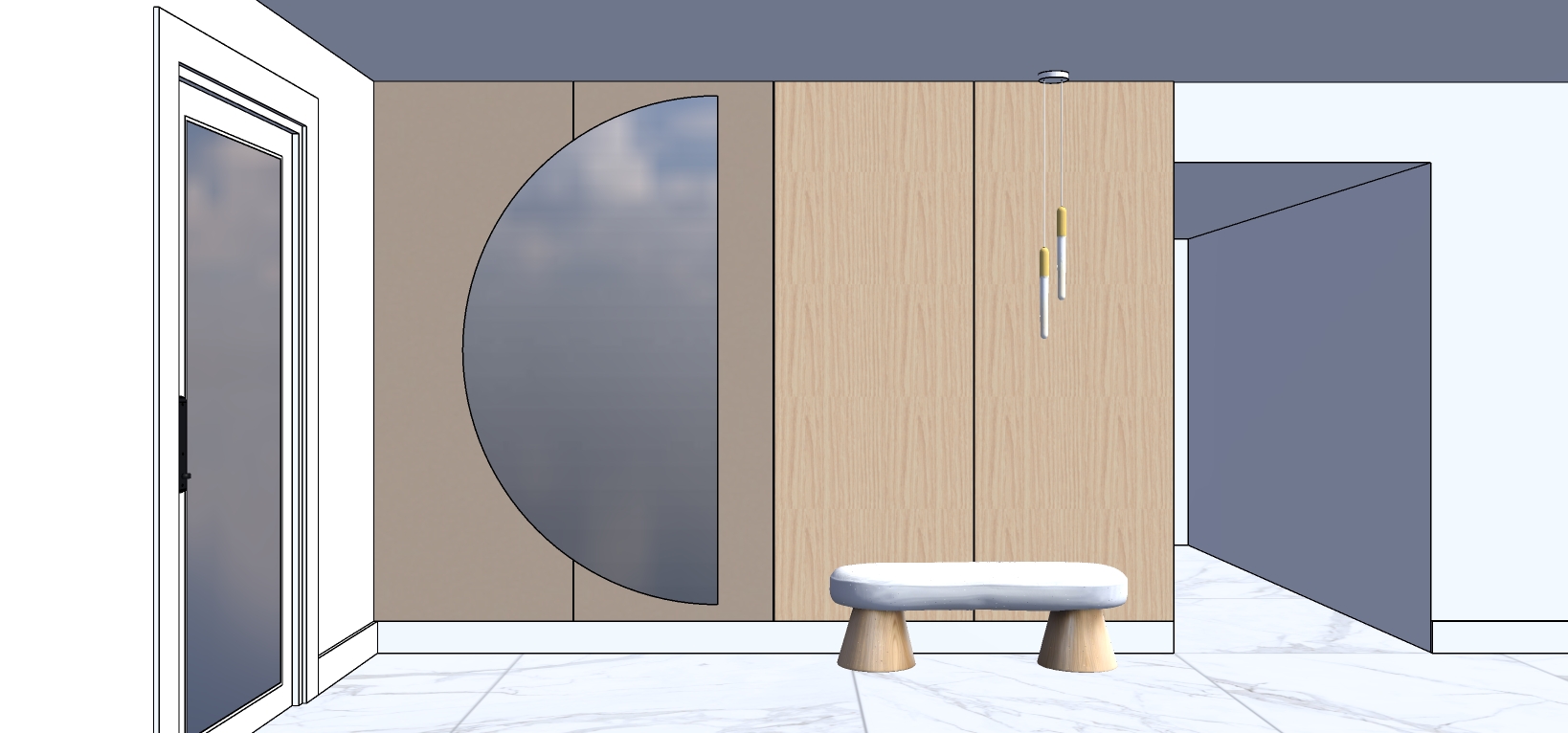 create a photorealistic interior render based on the uploaded image keep the original layout proportions and architectural elements unchanged the overall aesthetic must feel bright clean and modern luxury color control critical all walls must remain pure matte white smooth plaster finish no tint no gray shift no warm discoloration clean minimal gallery like white maintain a bright white interior atmosphere airy exposure no dark or moody lighting door details keep the door completely white white door panel white frame and trim clean modern finish the center glass must be frosted glass soft translucent diffusion realistic frosted texture subtle light transmission design modification only this addition add a floating wall mounted cabinet intersecting the mirror minimalist and modern thin elegant proportions light wood or soft neutral finish stylish partial overlap with the mirror floor material use high gloss polished white marble flooring subtle gray veining glossy reflective finish clean luxury look realistic but refined reflections render style ultra clean architectural visualization bright luxury aesthetic soft global illumination accurate whites no yellow cast premium interior render quality important restrictions do not add chandeliers or ceiling lights do not add benches or furniture do not modify layout or architecture keep mirror shape and panel alignment preserve original composition