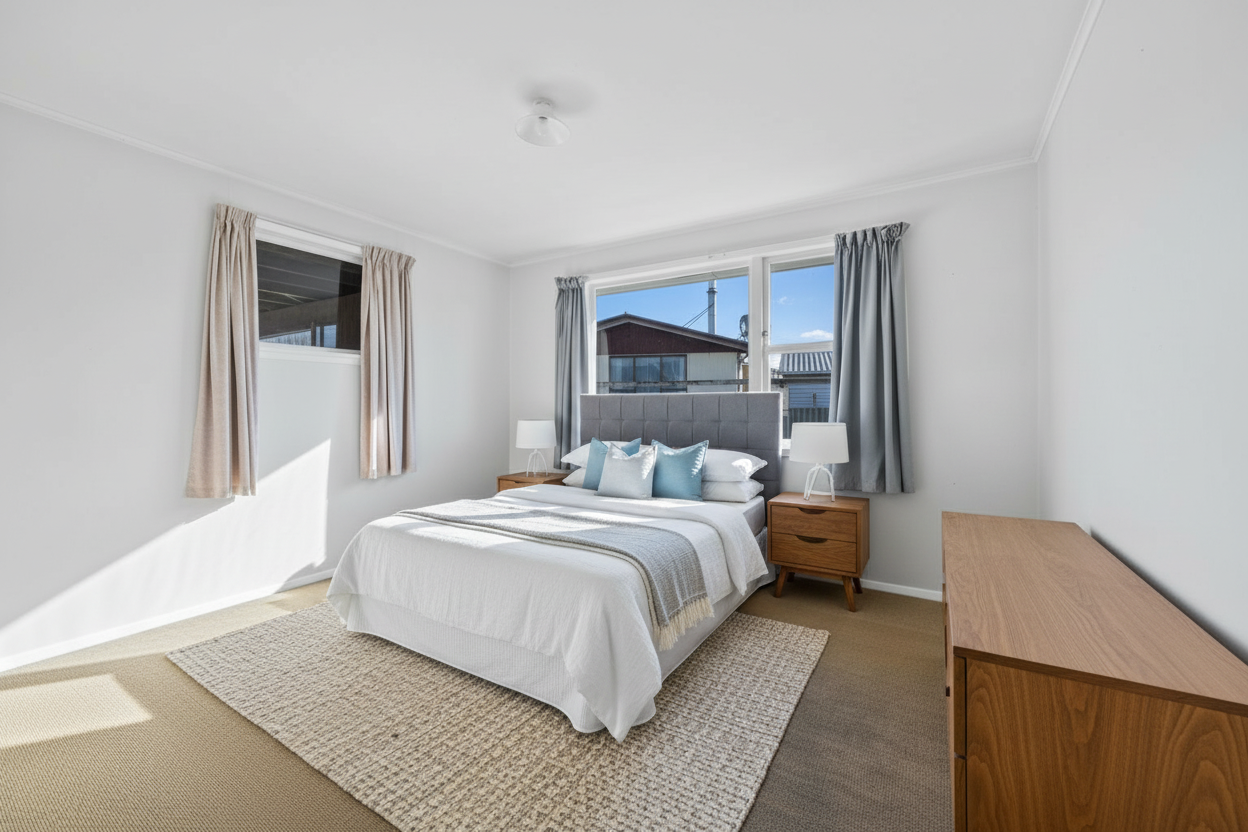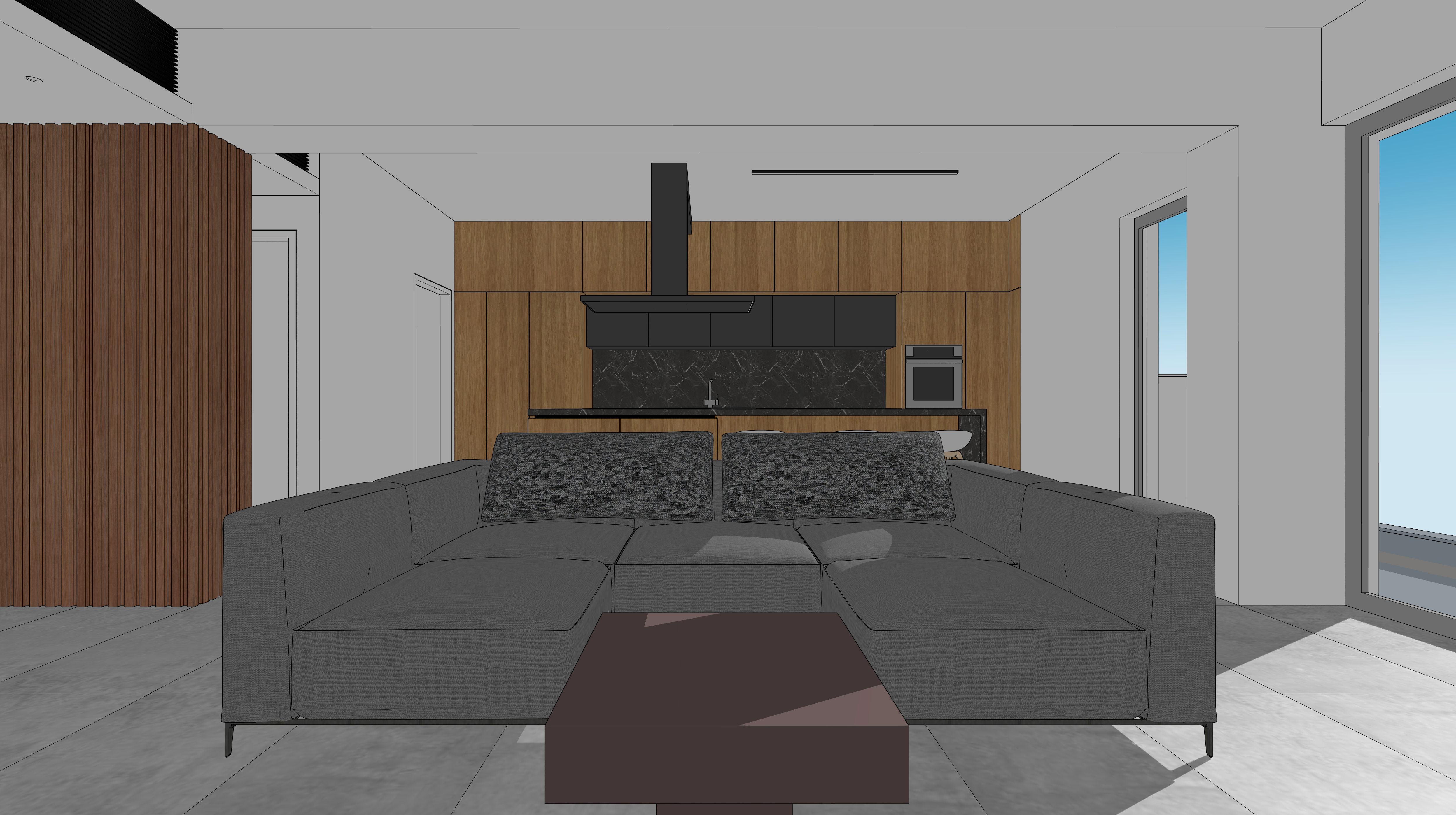 modern minimalist interior open plan living room and kitchen exact geometry preservation same layout and proportions do not change furniture or architecture natural oak wood kitchen cabinets black marble backsplash and island grey fabric sofa grey tiled floor soft warm natural daylight from large openings indirect lighting calm luxury atmosphere clean composition architectural photography photorealistic high detail materials soft shadows neutral color palette realistic reflections no redesign recessed ceiling lights turned on soft warm led lighting indirect ambient lighting under cabinet lighting illuminating kitchen surfaces realistic light glow soft shadows