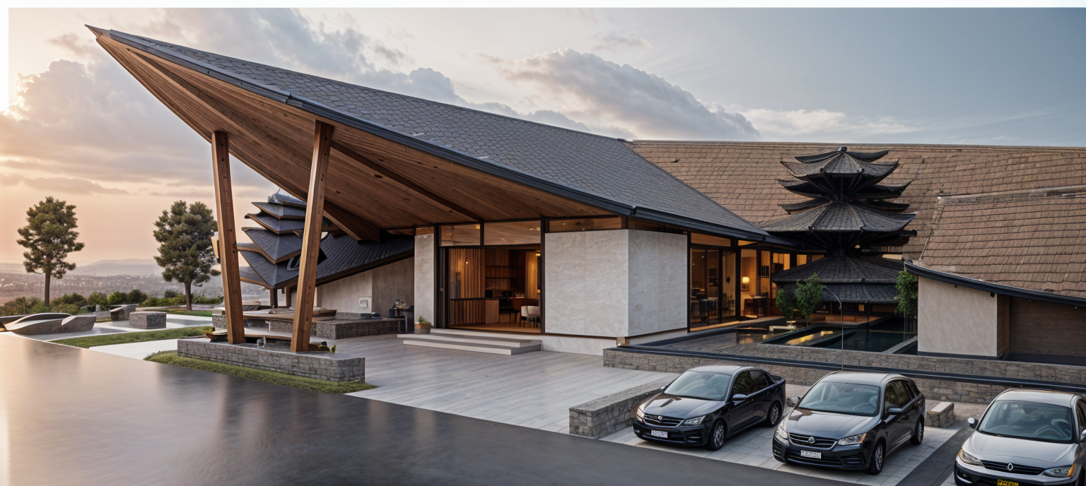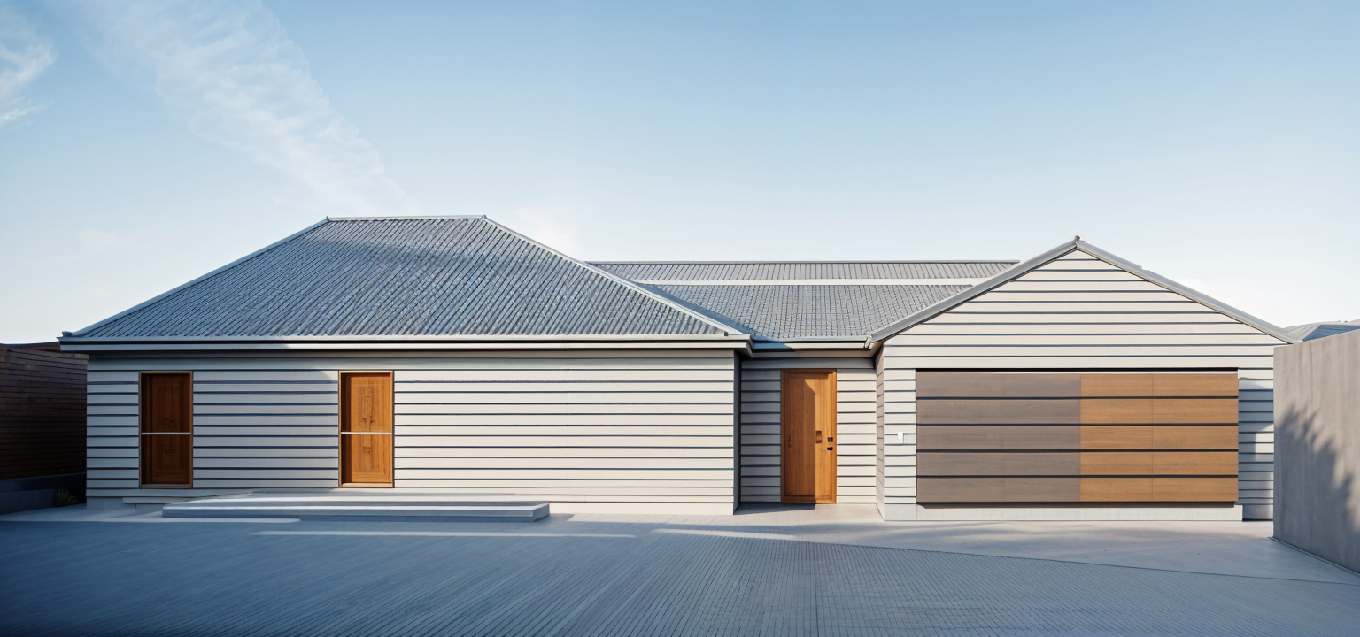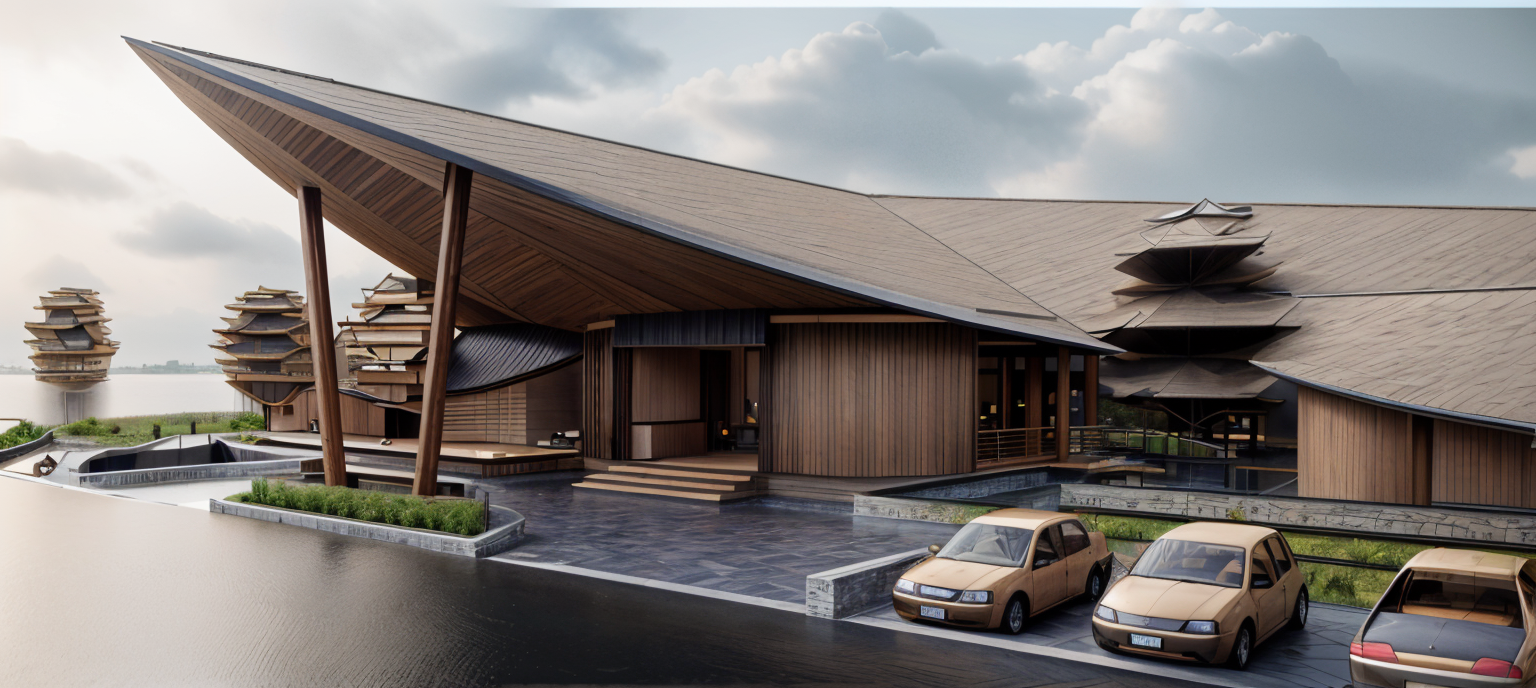 exterior shot realistic natural scene building in lake around with grass field roof shingle rood wood color architecture