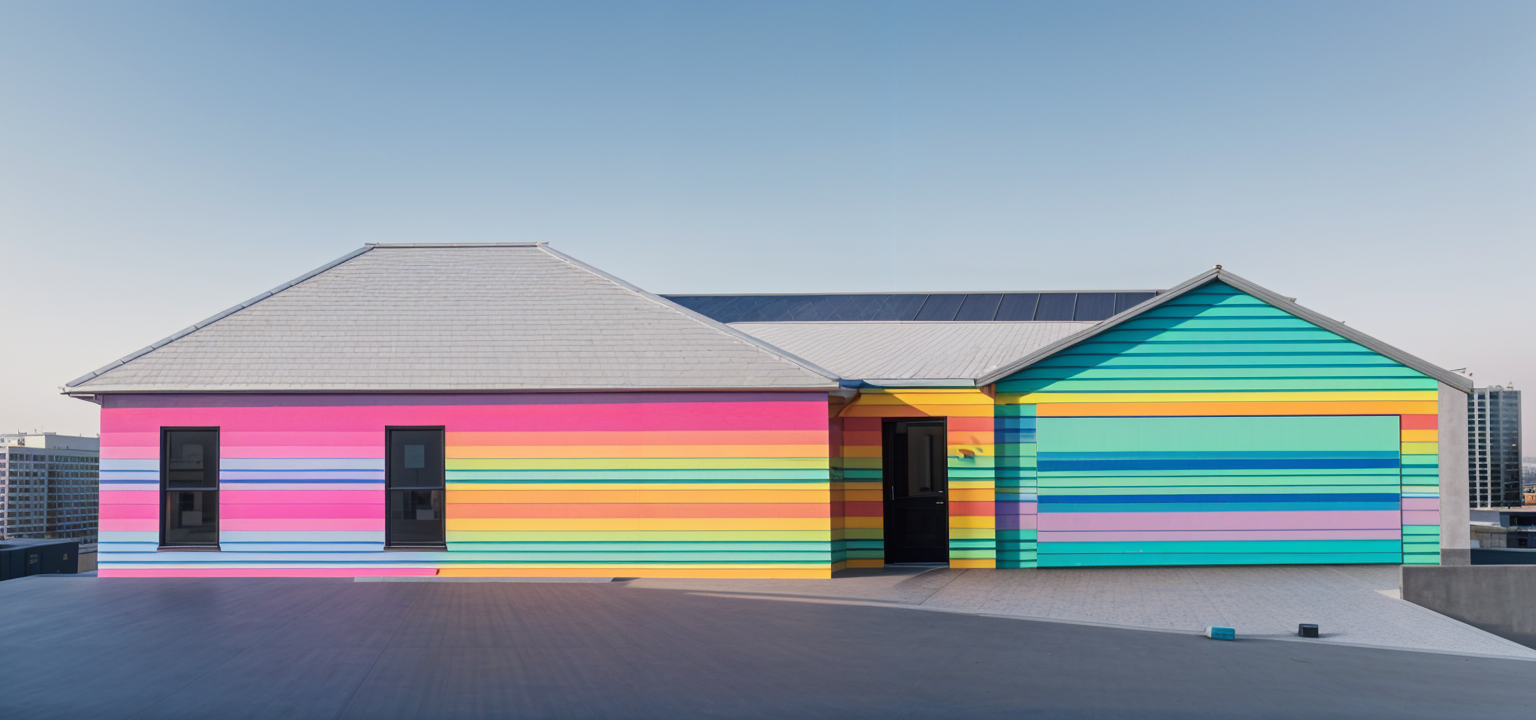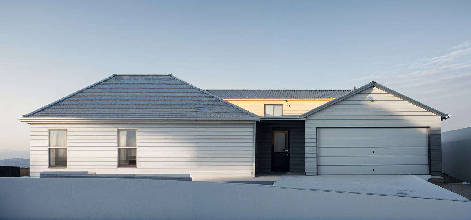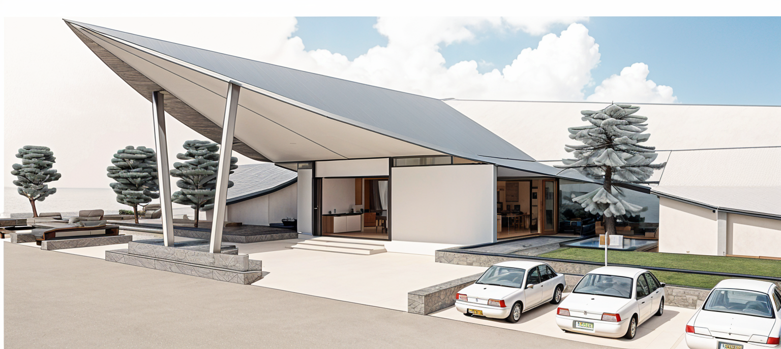 exterior shot realistic natural scene building in lake around with grass field roof shingle rood wood color architecture