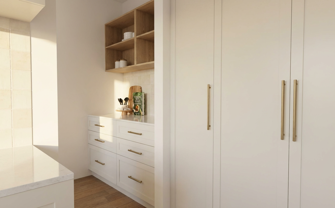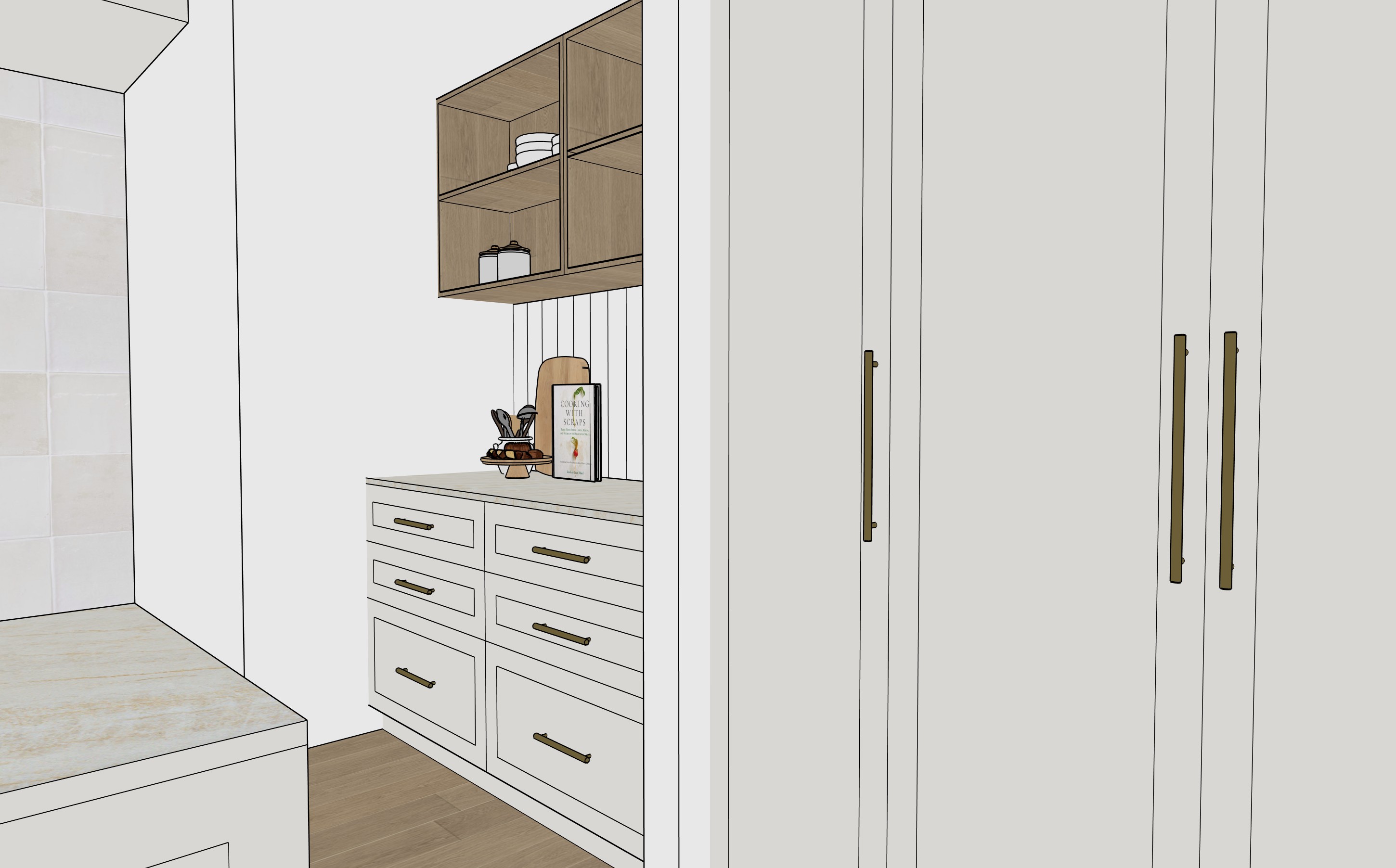 splashback is vj panelling timber is light oak cabinetry is soft light beige shaker style no lighting to underside of cupboards