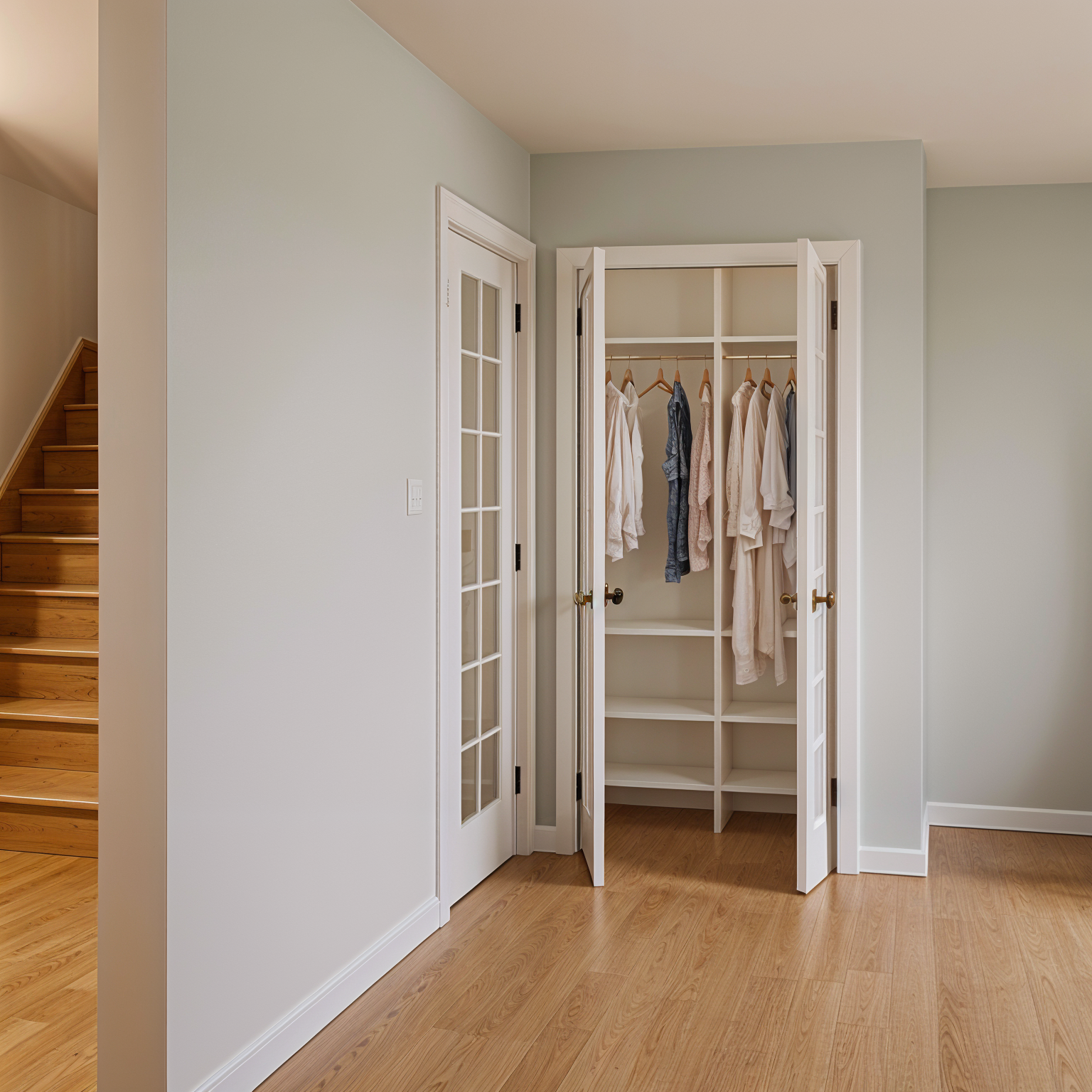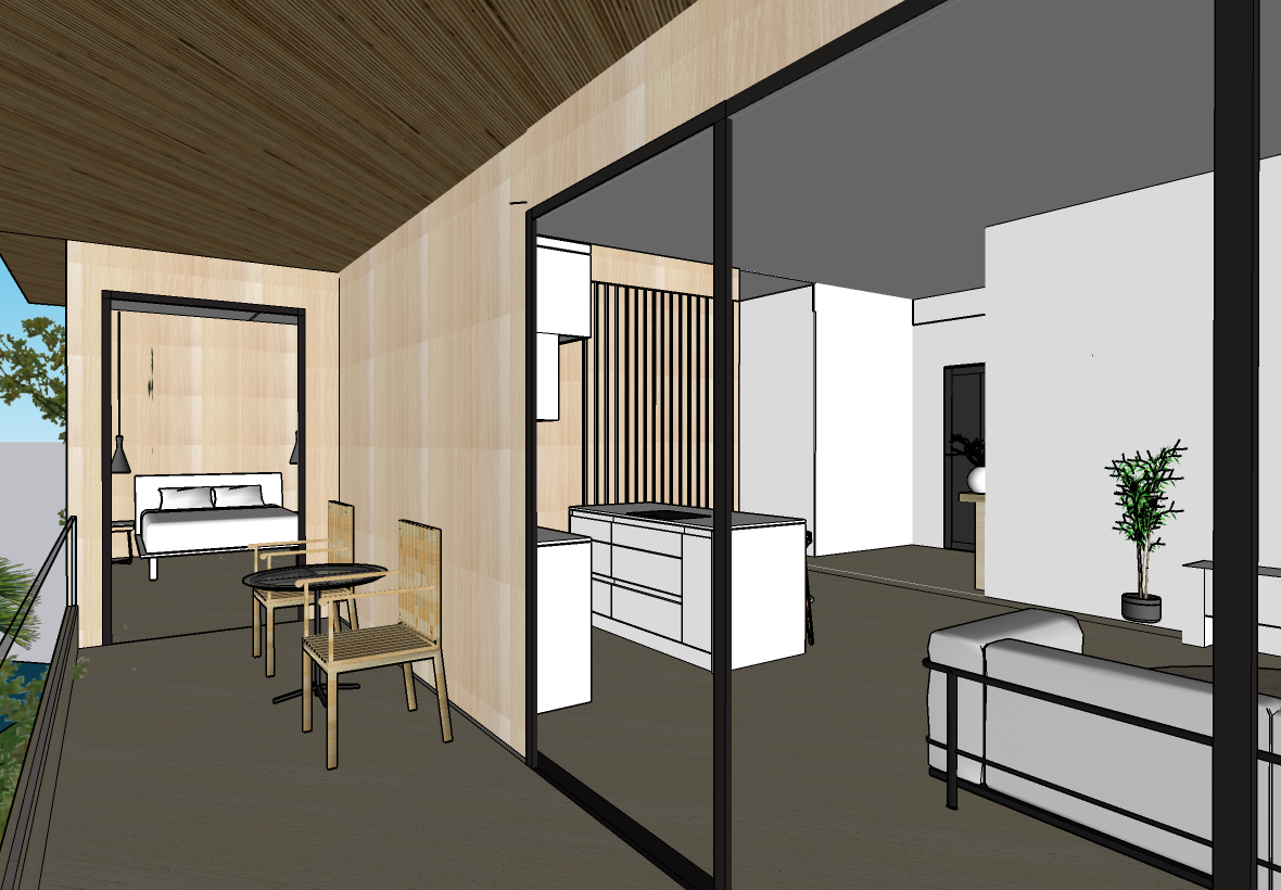 render a serene modern balcony overlooking a calm blue sea enhancing the natural light and architectural details use warm earthy tones for the wooden elements creating a natural feel ensure the glass table is transparent and reflective capturing the sunshine subtly the sky should be a gradient of light blue to deep azure embodying a peaceful morning scene add lush green foliage in the background for contrast and maintain a tranquil inviting atmosphere