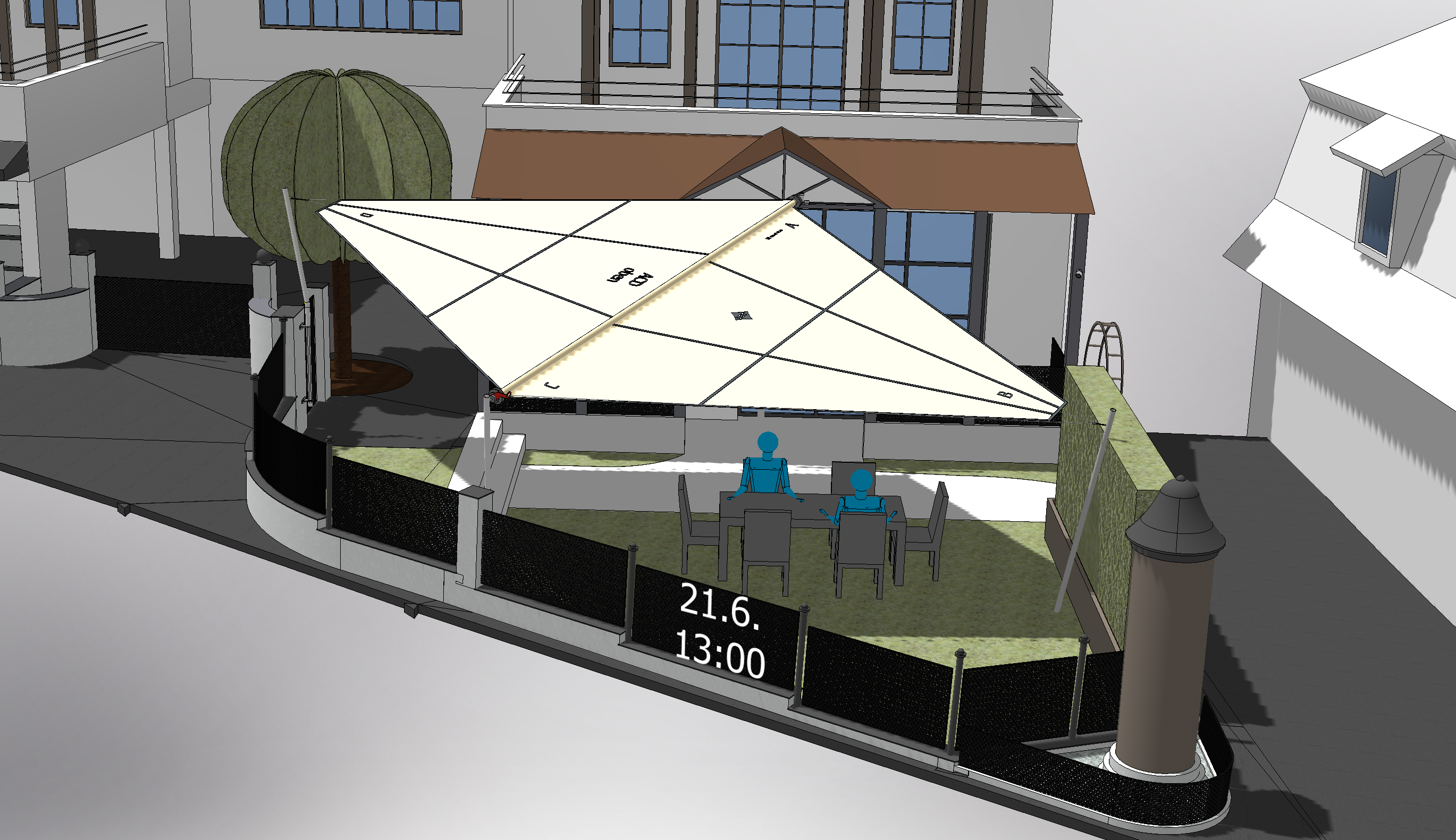 photorealistic enhancement of an existing cad rendering use the provided image as a strict immutable reference maintain geometry proportions scale dimensions colors materials shadows camera angle and composition exactly 1 1 do not add remove move resize or redesign anything buildings and sun sail must remain completely unchanged in shape position and appearance the existing shadow visible in the image must be preserved exactly as is with no modification no softening and no recreation keep the plain original background grey or light blue exactly as shown with no sky replacement and no environment improve only visual realism through subtle physical light behavior clean shading realistic surface response and refined material appearance lighting bright sunny daytime neutral daylight friendly and realistic no dramatic or cinematic mood the result must look like a high quality architectural visualization technically accurate neutral and realistic not artistic or stylized explicitly forbidden trees bushes plants grass ground textures people vehicles animals sky clouds hdr environment maps added or removed objects altered geometry or proportions new changed or missing shadows background changes of any kind cinematic lighting golden hour sunset dramatic contrast artistic styles illustration painting sketch fantasy bloom glow vignette blur noise color grading no creative interpretation no design changes no environmental additions the final image must be visually identical in structure to the autodesk inventor rendering but more realistic in lighting and material response only