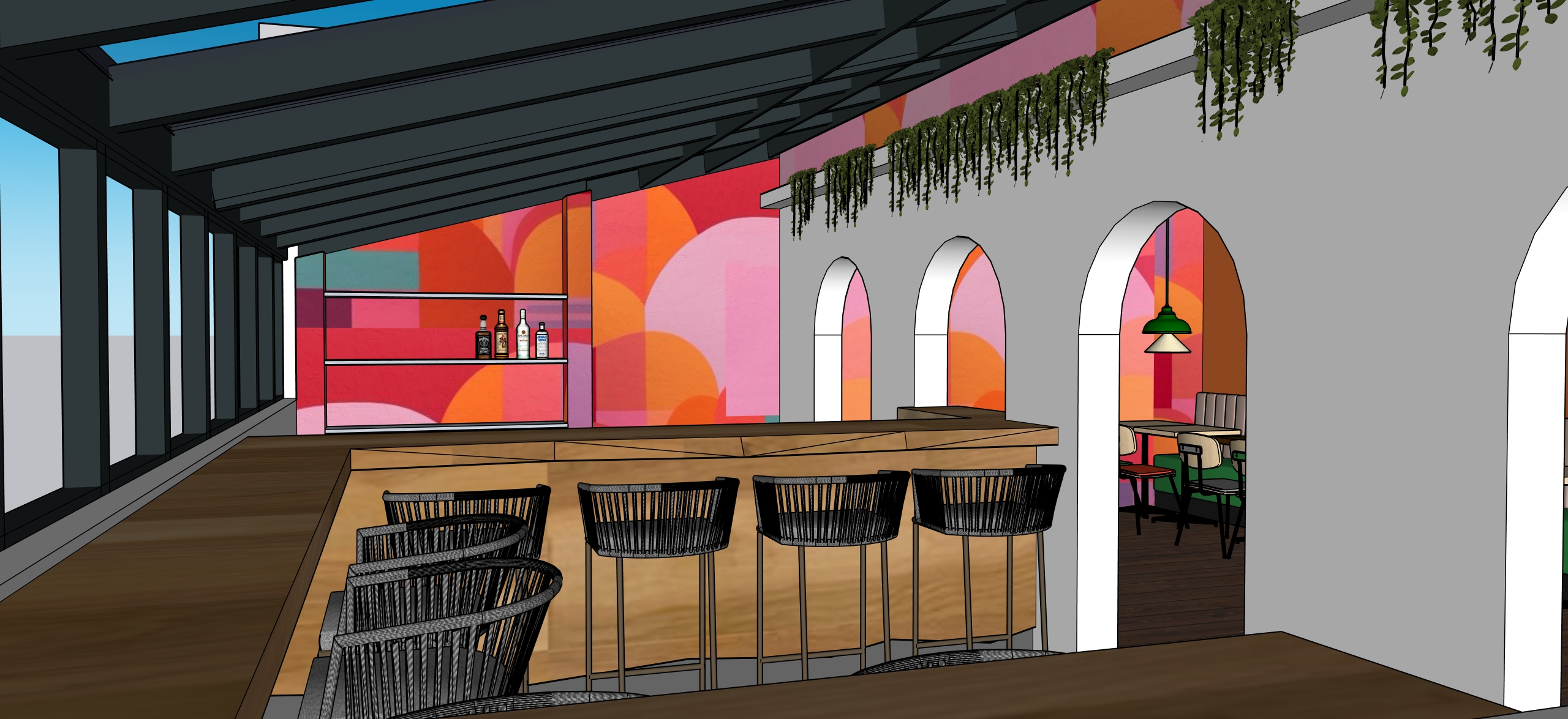 a simple modern salvadoran bar interior warm and inviting blending contemporary minimalism with subtle central american cultural identity clean architectural lines polished concrete floors and light natural wood finishes a sleek bar counter with textured plaster or terrazzo front paired with handmade ceramic tiles inspired by salvadoran patterns back bar shelving with artisanal bottles soft amber backlighting and woven accents incorporate natural materials such as wood clay linen and cane accent decor includes subtle references to salvadoran culture indigo textiles geometric patterns and locally inspired artwork seating includes simple wood stools and low profile lounge chairs with neutral upholstery lush tropical plants palms monstera soften the space lighting is warm and atmospheric pendant lights in woven fibers soft indirect lighting and candlelight glow color palette warm neutrals sandy tones terracotta deep indigo accents the space feels intimate relaxed and authentic without being overly thematic