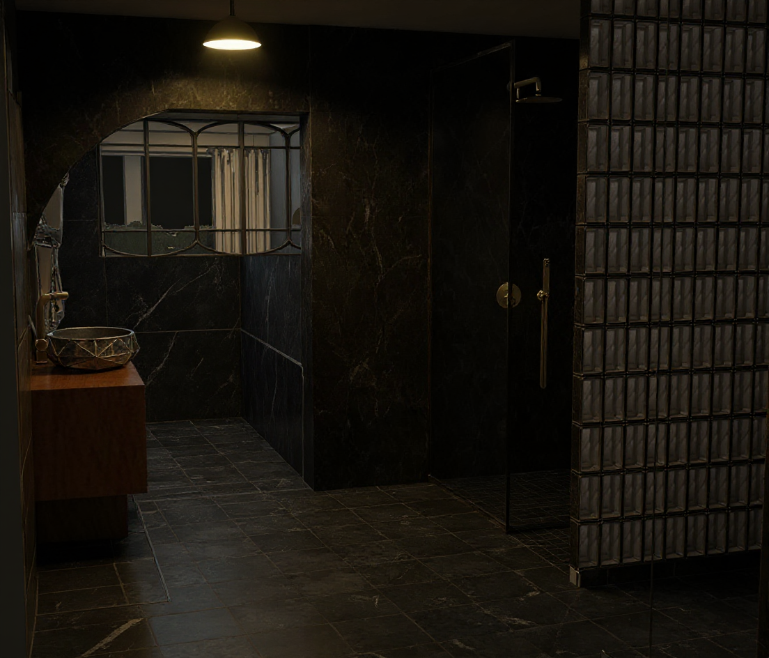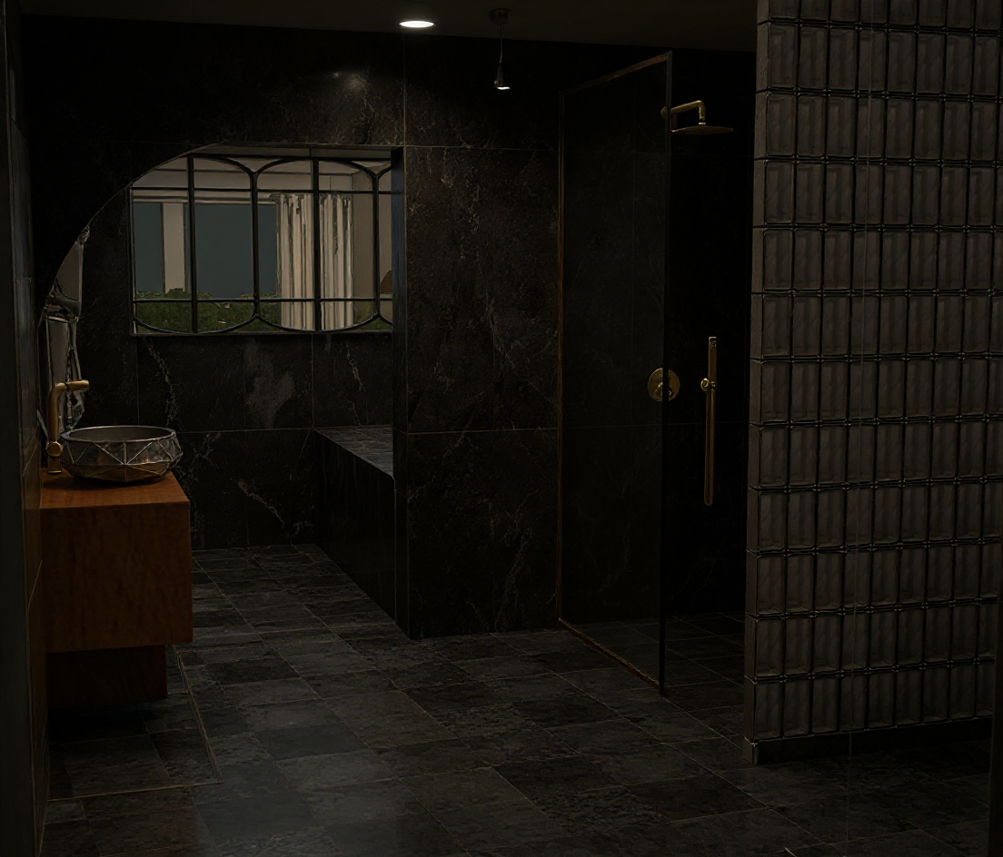 mur marbre noir et dorure plafond avec spots paroi douche en pav de verre noir robinetterie dor arche arrondie meuble vasque noyer vasque en pierre verri re art d co dans le fond r tro clairage