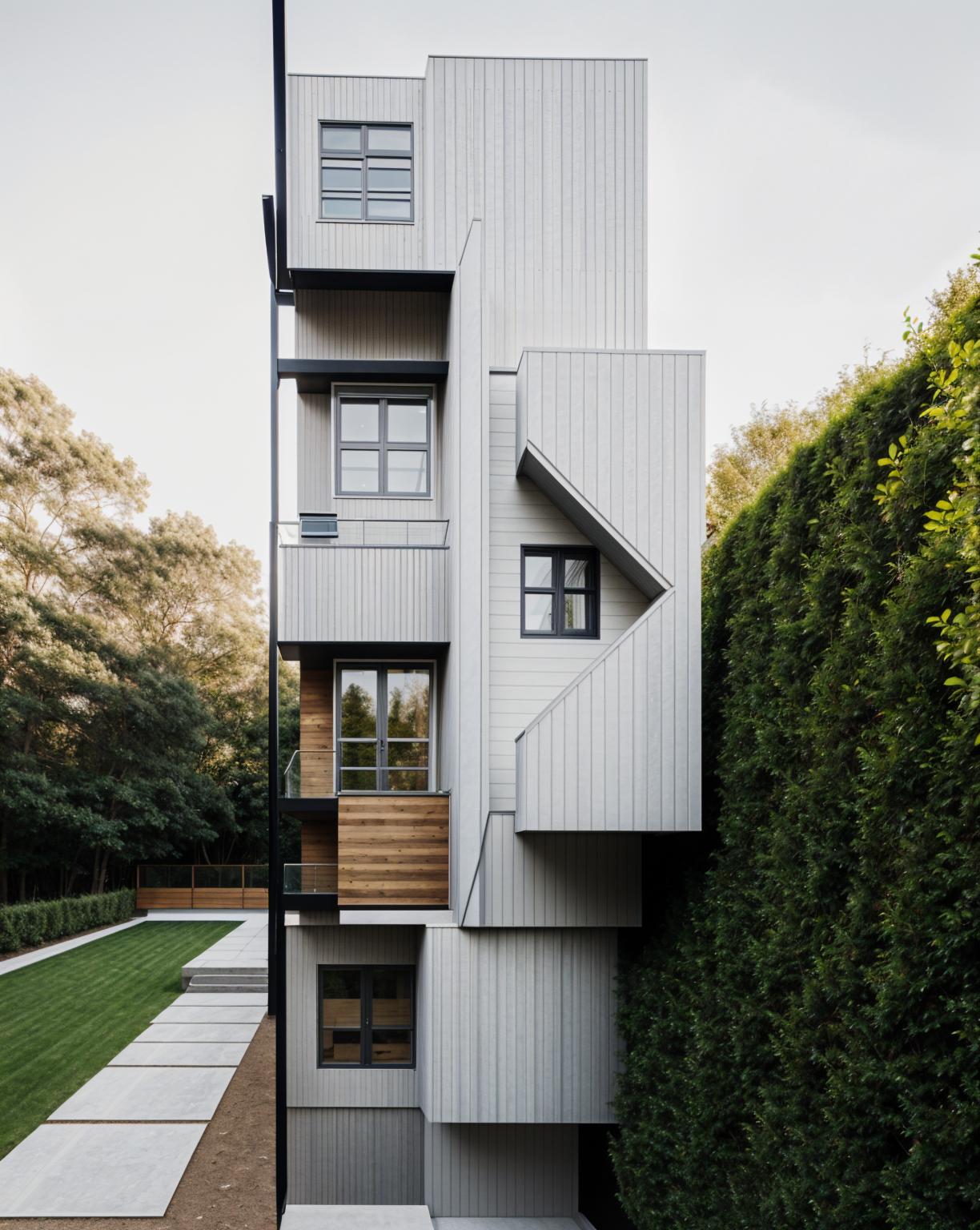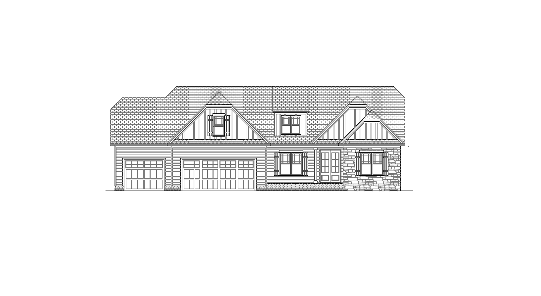 exterior shot a charming suburban house with a classic design render the house with a warm beige exterior and a light gray shingle roof the window shutters and doors should be a deep forest green adding a touch of elegance use a soft cream color for the trim around the windows and doors the stone facade on the right side should be a mix of light and dark grays creating a textured natural look set the house in a peaceful sunny atmosphere with a bright blue sky and fluffy white clouds surround the house with lush green grass and a few flower beds with colorful blooms around the base