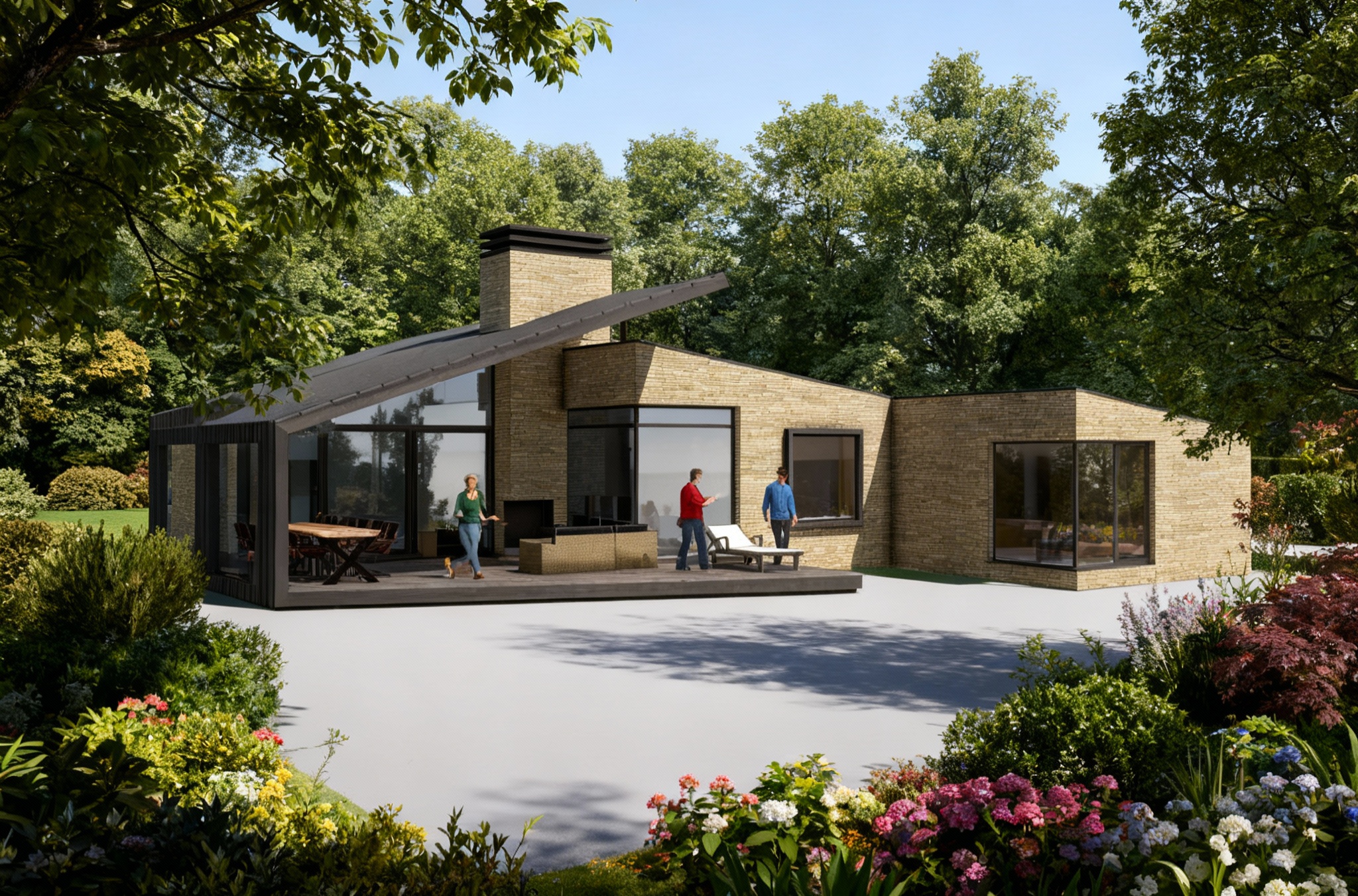 sliding door bubbled glass walnut backwall seamless parquet flooring