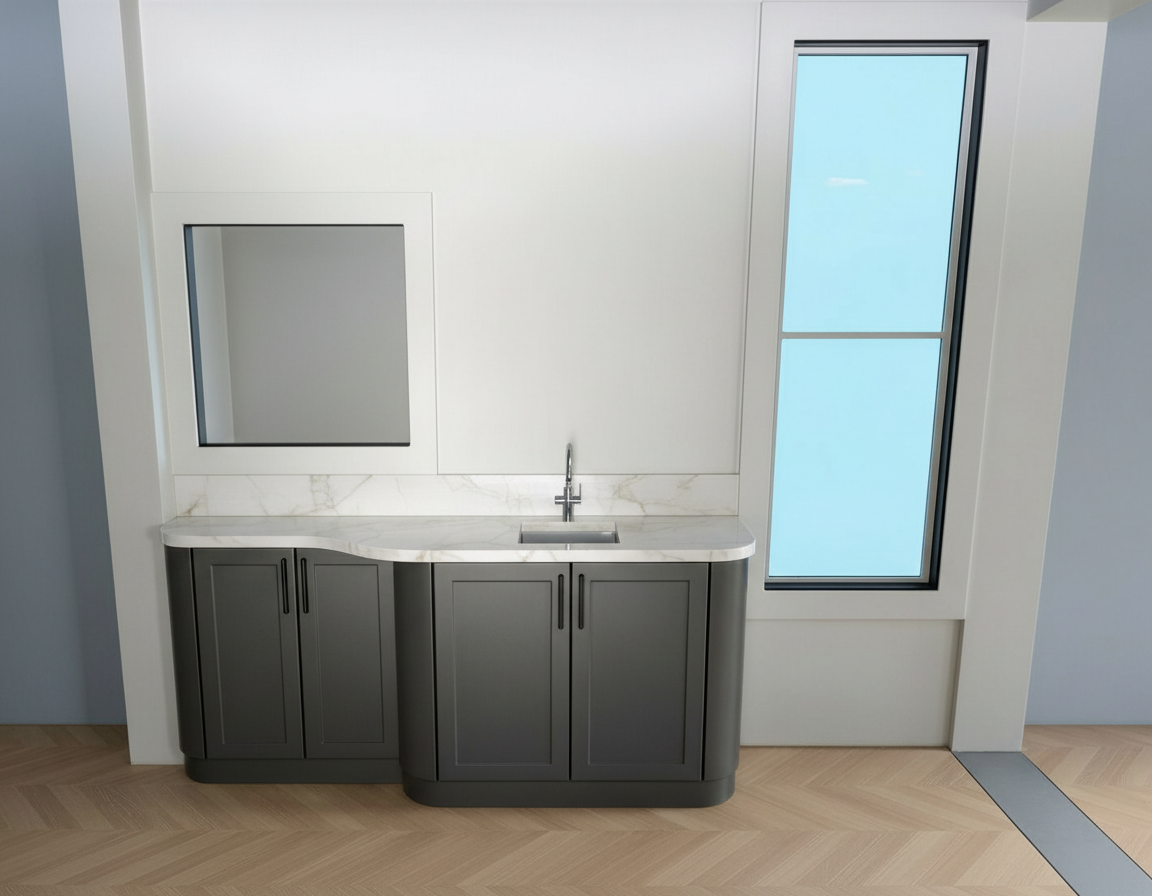 aerial view of a beautifully landscaped park layout with soft green spaces and architecture incorporate a variety of vivid greens for the trees and grass soft blues for the water bodies neutral grays for the pathways and light earthy tones for the structures there is a dark red boundary line for the main part of the site with everything outside of the boundary line in a lighter colour to emphasise the site within the red boundary line direct sunlight from above at midday no shadows on the ground