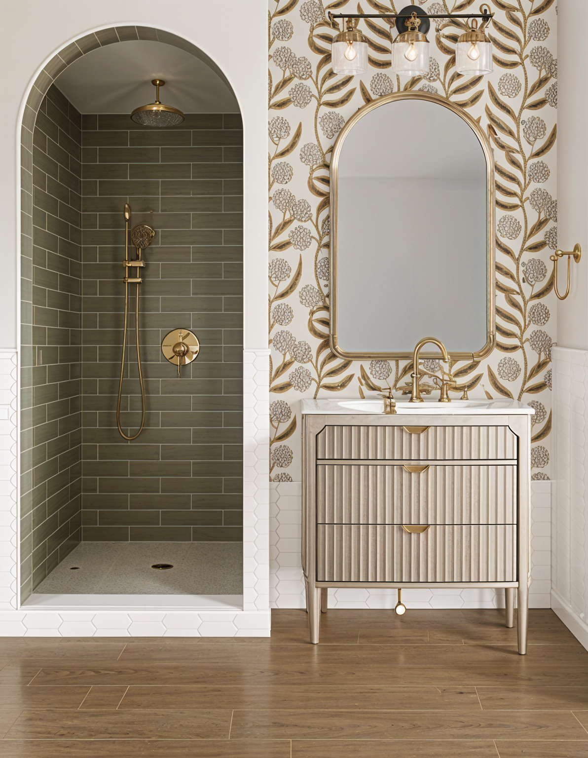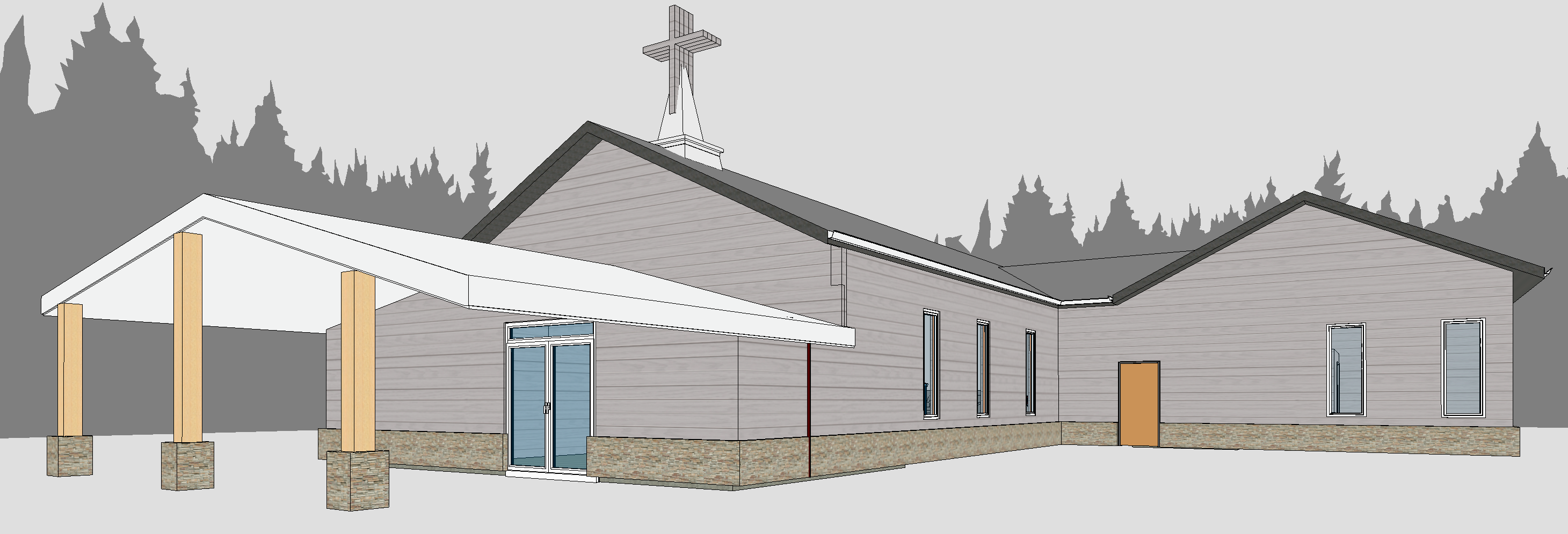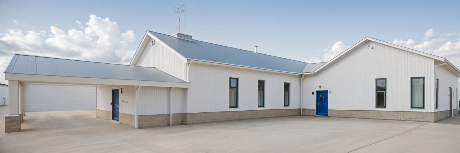 white hardie board siding metal roof long rectangular windows small parking lot country side background glass door architecture