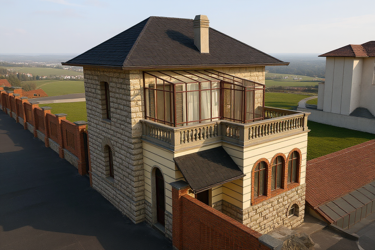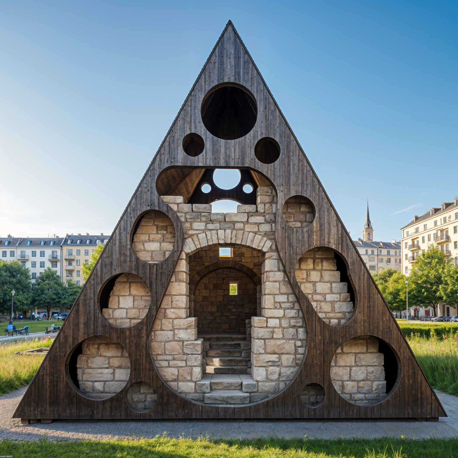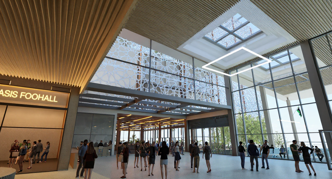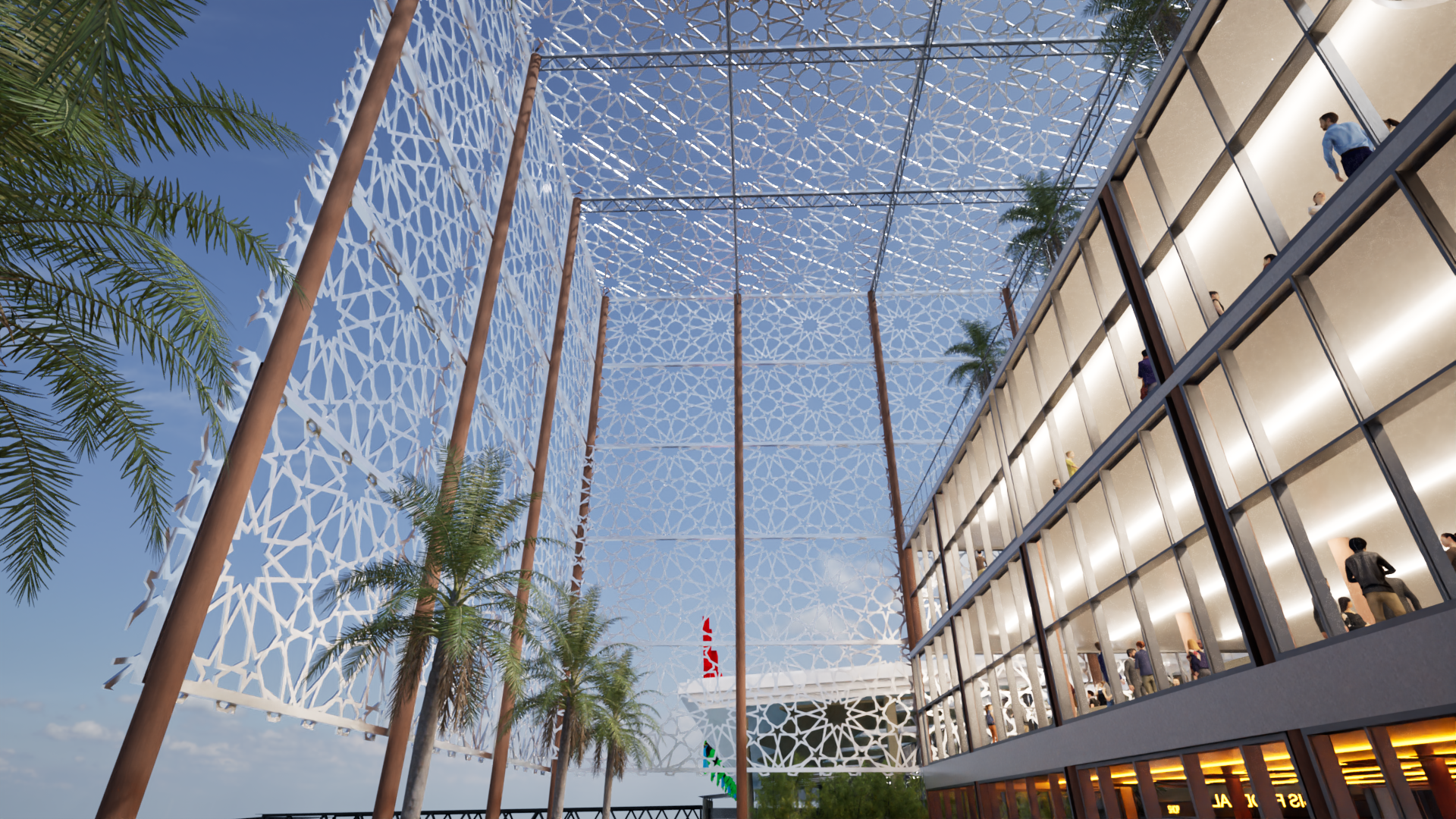the image depicts an architectural structure with intricate geometric patterns on its facade the structure features large windows and is surrounded by palm trees under a clear blue sky
