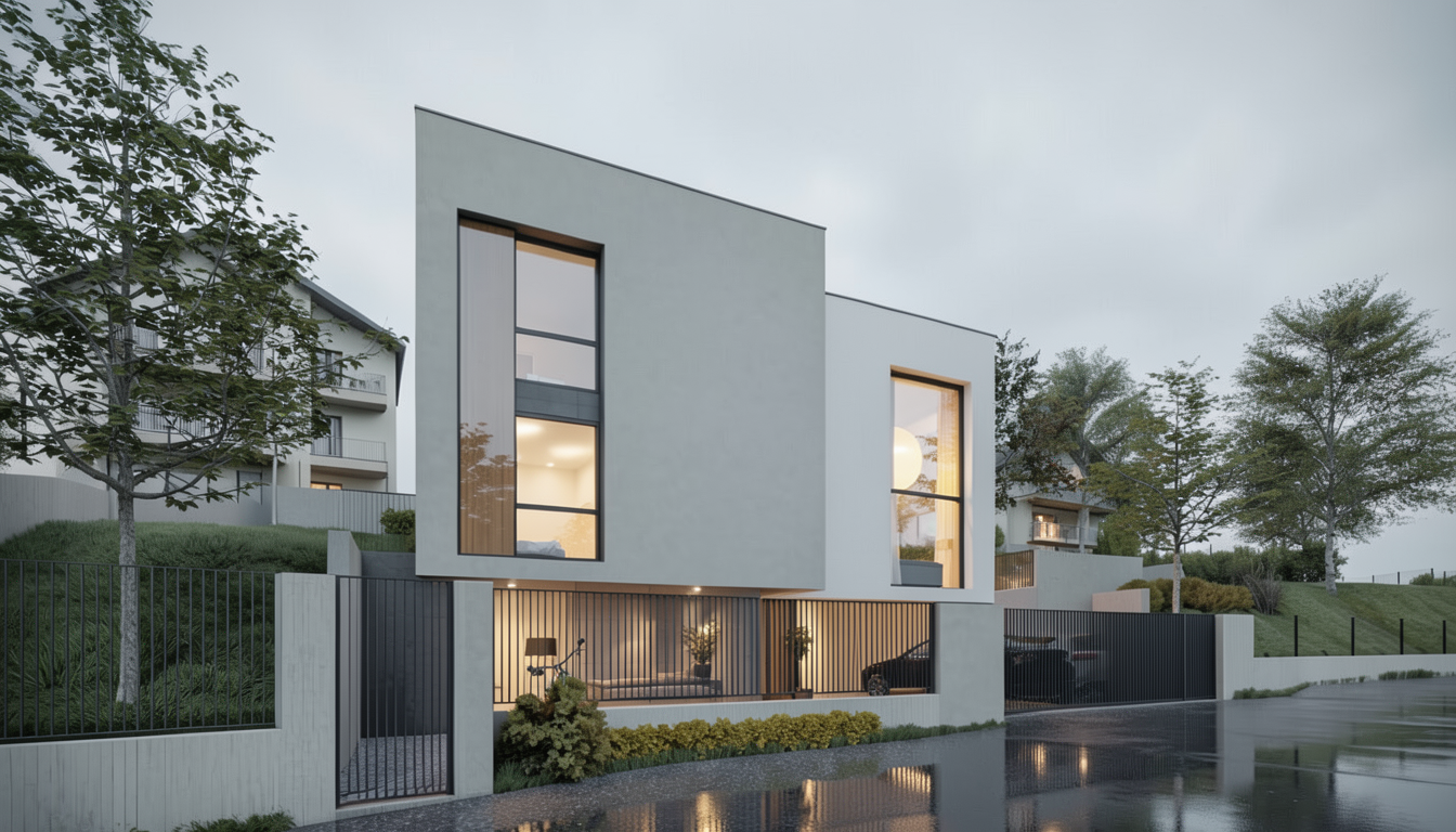 important preserve the existing geometry and the existing context exactly as provided do not modify alter reinterpret add remove scale or reshape any geometry do not change the site surroundings street layout neighboring buildings vegetation or context elements do not modify geometry scale proportions buildings road layout sidewalks or surrounding context in any way do not change text photorealistic architectural rendering clean and balanced contrast calm cinematic mood style contemporary european residential architecture minimalist premium understated do not alter the church color soft overcast noon atmosphere diffused natural daylight with subtle blue grey tones cinematic architectural mood large glass surfaces with realistic reflections soft mirror effect subtle environmental reflections of sky and surroundings wet pavement with smooth reflective surface soft light bounce and blurred reflections high dynamic range lighting realistic global illumination soft shadows calm and minimalist nordic mood photorealistic architectural visualization balanced exposure no harsh highlights add interior warm light do not change anything