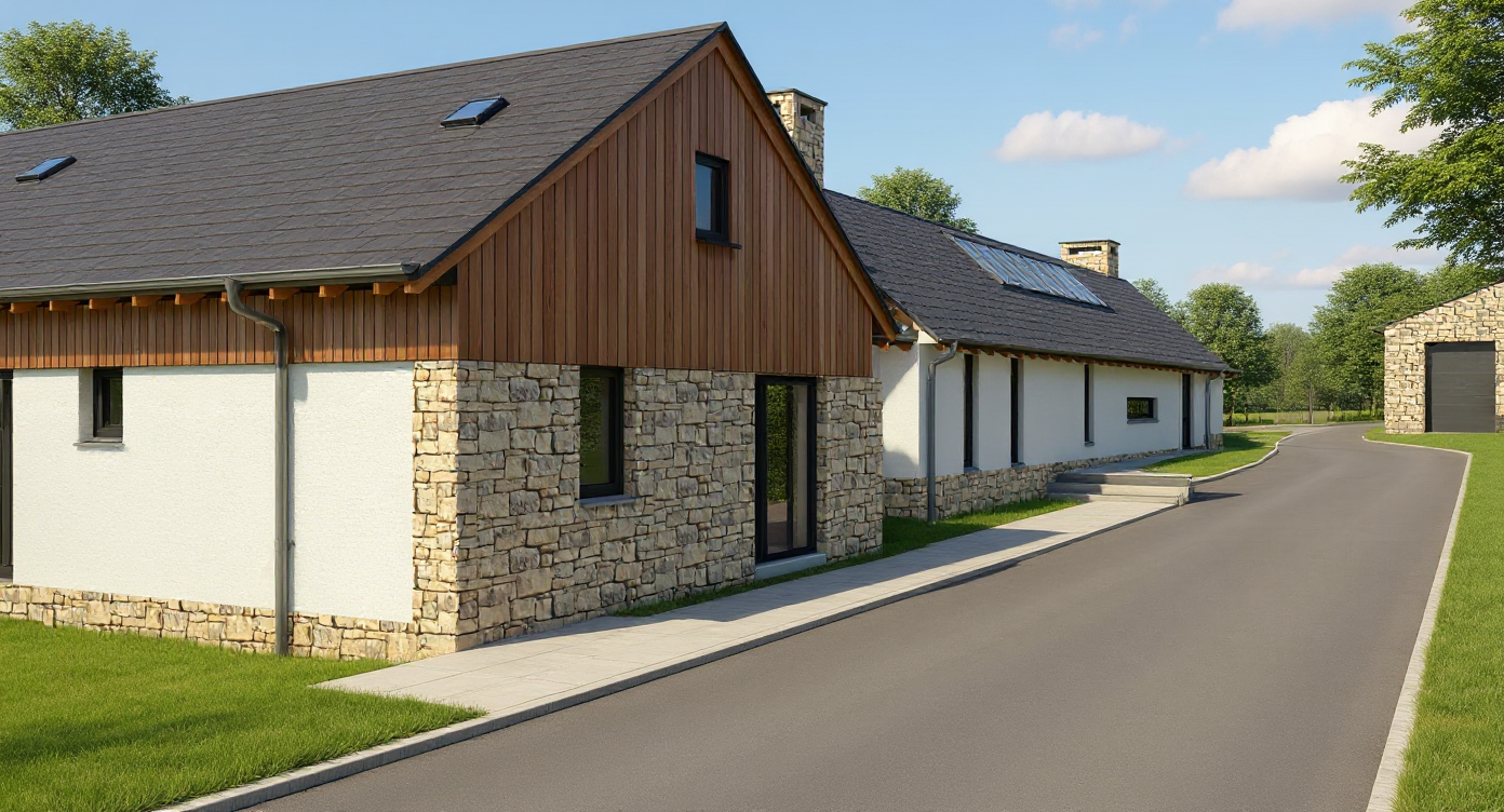 nordic exterior shot quita la ciudad del fondo y pon arboles la pared del fondo es opaca pon reflejos en el agua de la piscina architecture