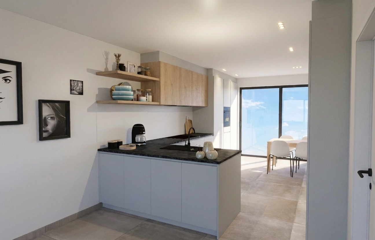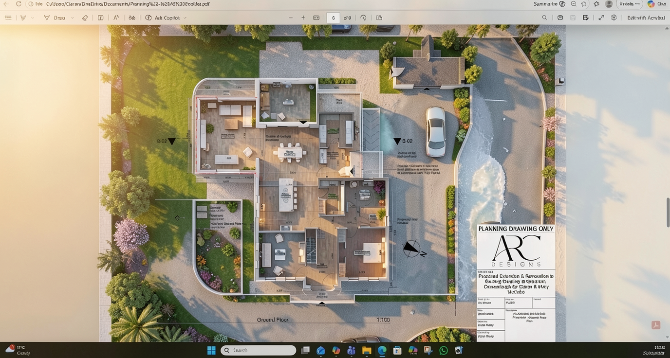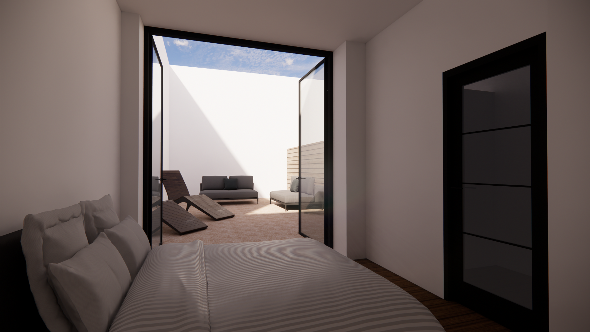 create a hyper realistic rendering with soft morning light through the doors interior shot of modern bedroom with doors opening up to yard with seating area and greenery the flat is in athens greece modern abstract artwork above bed colourful throw on bed modern linear pendants above nightstands hidden led lights on the ceiling floor tiles 1 20x1 20 stone beige tone should be relaxing and inviting
