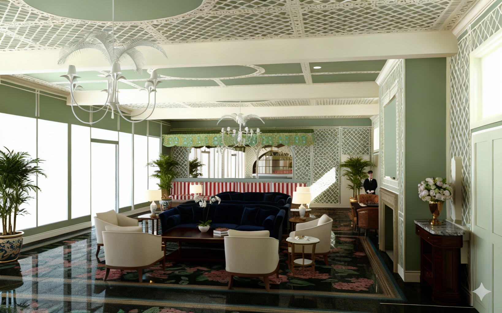 keep the banquette in the background make this image look inviting do not change the architecture of the room transform the seating to simple furniture placed in front of the fireplace swap the sofa for a navy blue velvet sofa ottomans parlor palms in chinoiserie planters natural light coming in from the window transform the texture of the floor to carpeting photorealistic realistic material textures