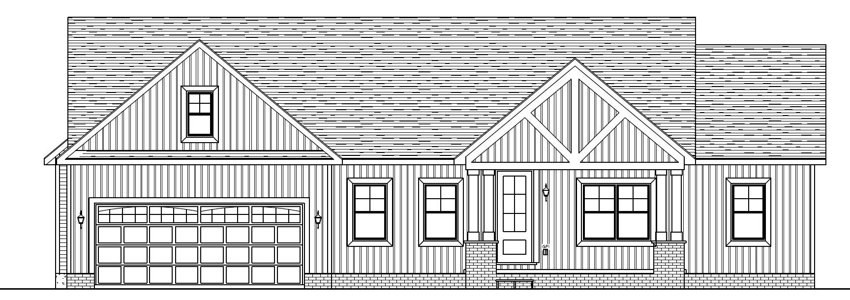exterior shot make as photorealistic as possible while keeping all architectural elements the same as selection add professional landscaping on a lightly wooded scene with good lighting the queen truss gable over porch is open to house wall