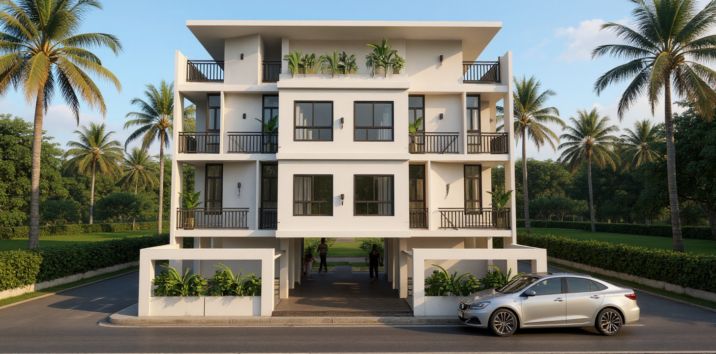 symmetrical facade on a landscape with trees surrounding the building add 1 car passing in front add people walking on the sidewalk in front