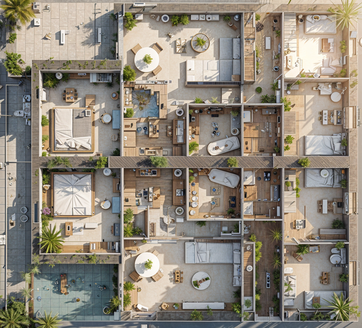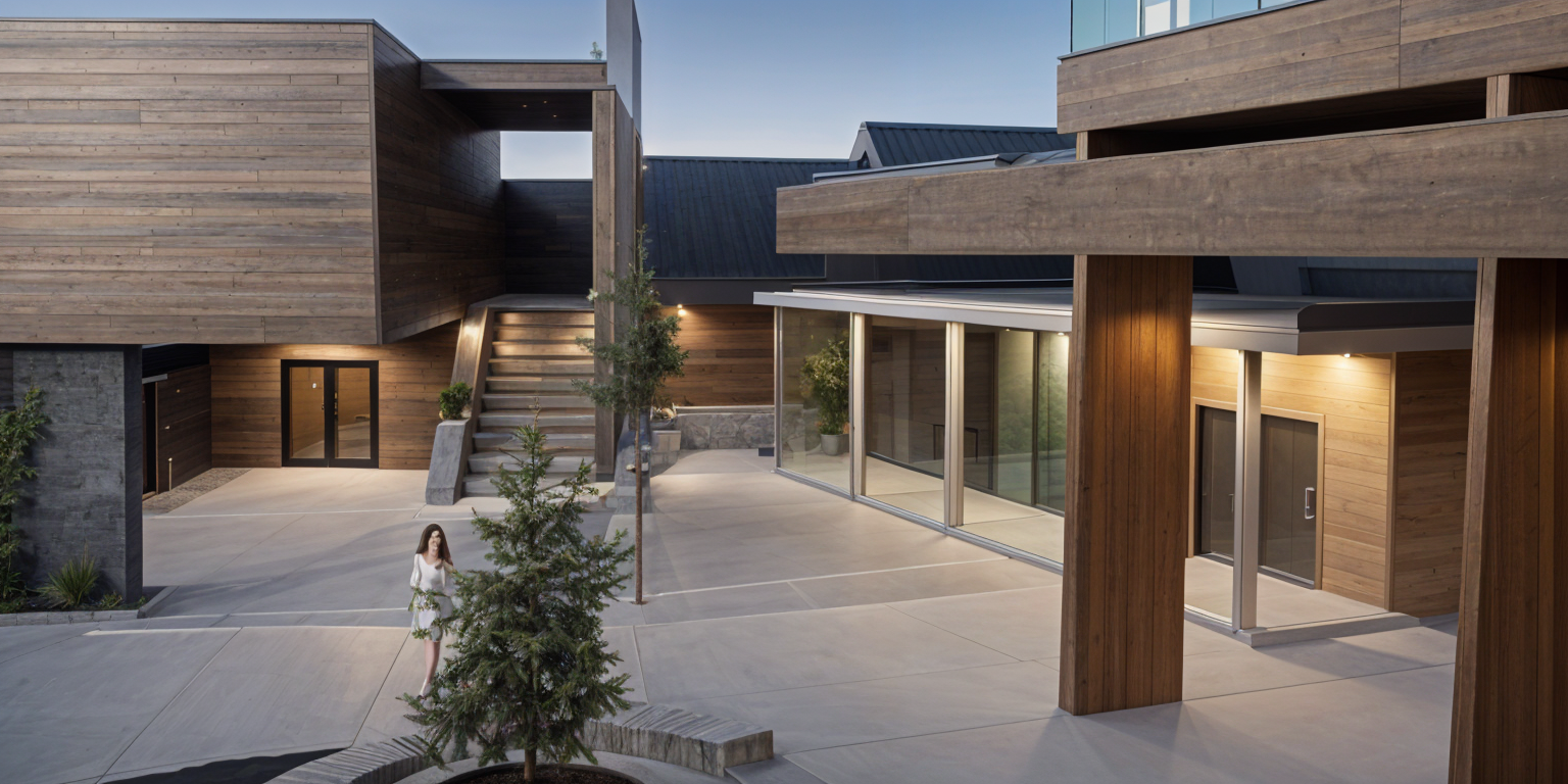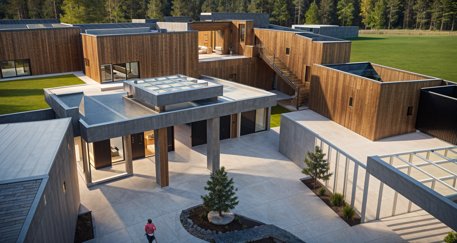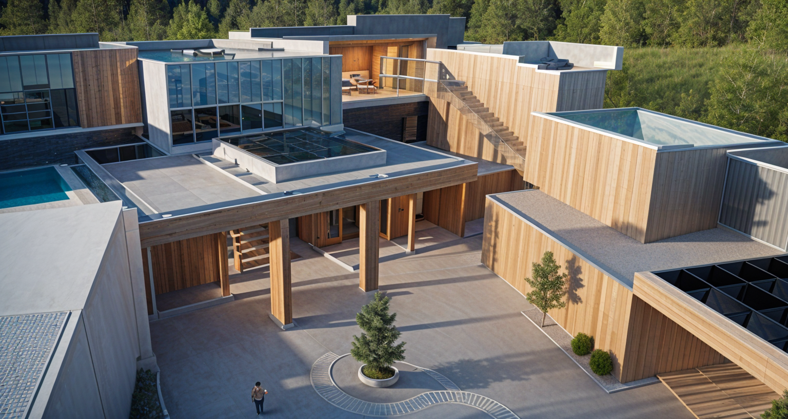 sarineen rooftop shot make this a sport center make the concept simple woody yet aesthetic with nature make it look like a sport public space with people make it look like evening and dont use all wood combine with grey make the room filled with people working out architecture