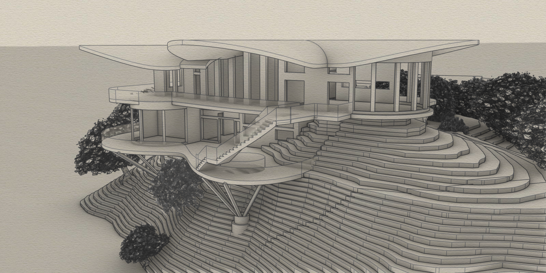 architectural watercolor rendering of a small contemporary research station perched slightly off of a rocky cliff structure made of warm wood black steel and glass precise and realistic architectural detailing cantilevered over stone terrain supported by steel beams surrounded by mountain pines and mist below rendered with crisp building geometry and realistic materials background and edges dissolve into loose watercolor washes and white paper edges not full bleed with soft unfinished fade around the image visible pencil and ink linework with light technical annotations artistic yet grounded balance of precision and painterly abstraction calm morning light concept architectural visualization style do not change geometry