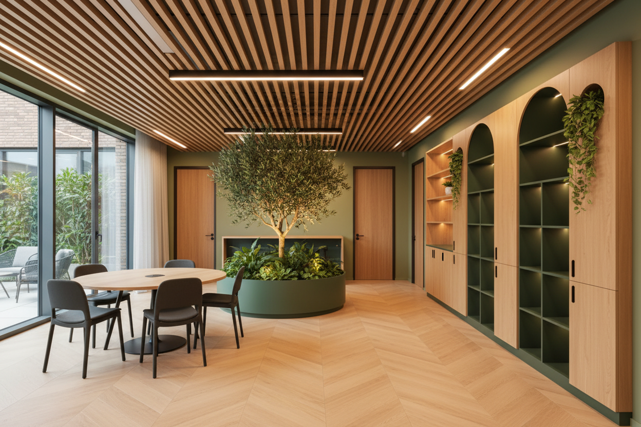 kids playground with artificial grass and lot of wooden elements