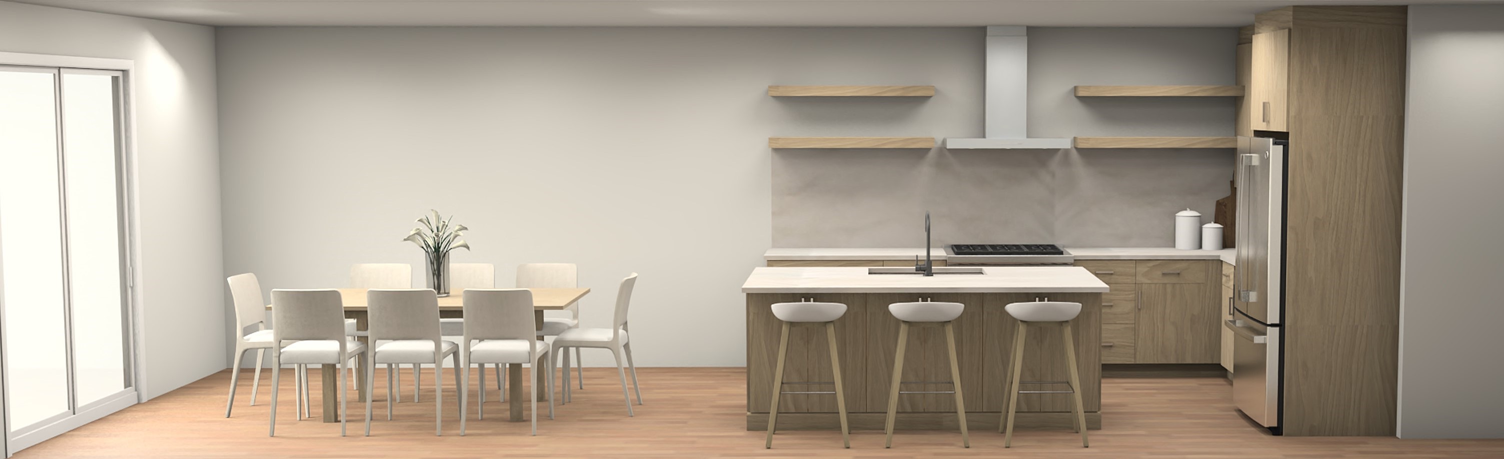 maintain light wood tone add warm lighting do not alter structure of room or cabinets or appliances