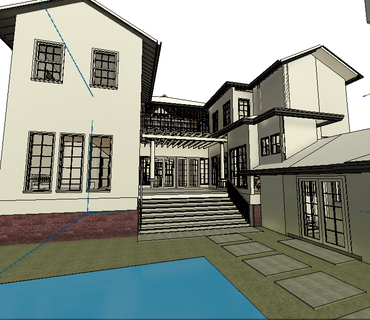 realistic image dusk sky turn on interior lights white washed brick walls white windows and doors white railings add potted plants remove railing at upper balcony add small border around pool roof rafters are white remove railing at upper balcony remove potted plant in window on left remove potted plant on window sill remove handrails at upper balcony