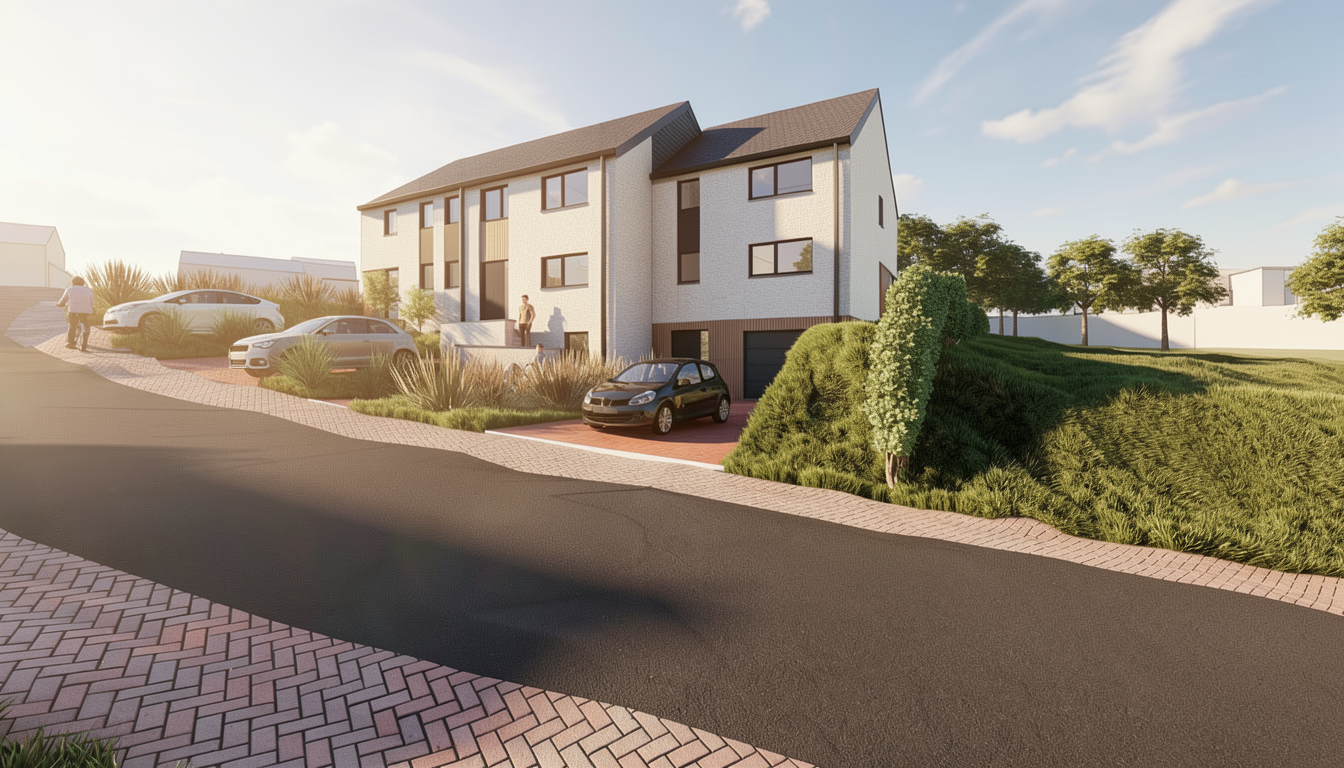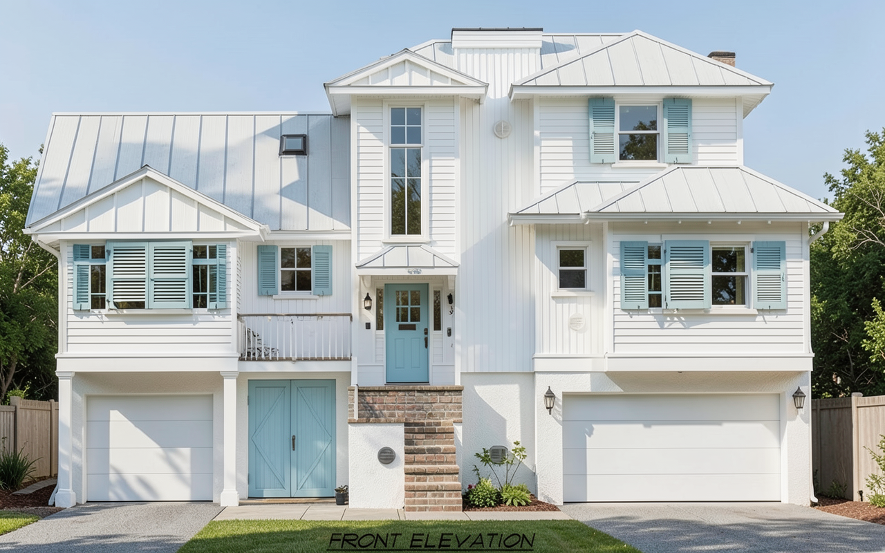 make as photorealistic as possible while keeping textures the same as selection professional landscaping with good lighting current material style just enhance them standing seam dark grey brown metal roof on sunny day