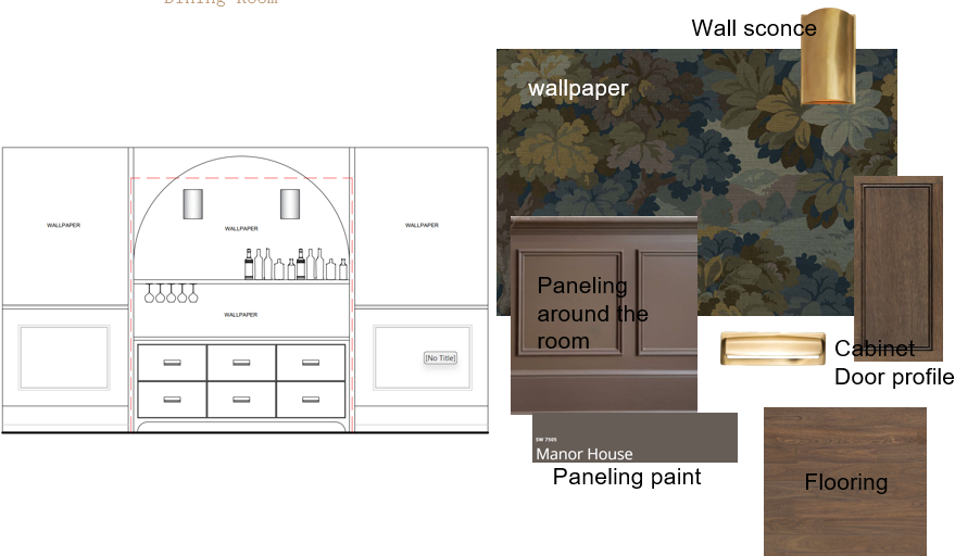 create a 3d elevation of this dining room bar the cabinets are wood and the barrel arch surround is also wood there is a floating shelf with wallpaper behind and brass sconces above