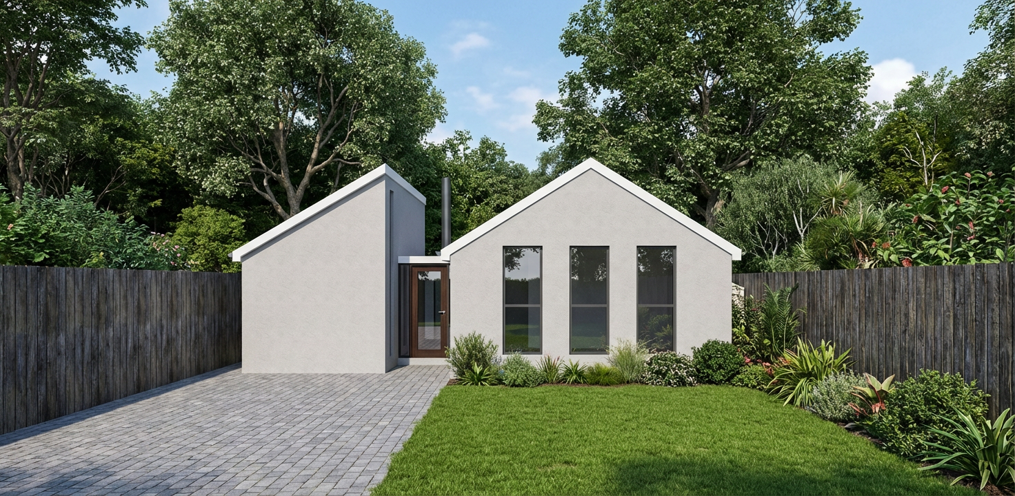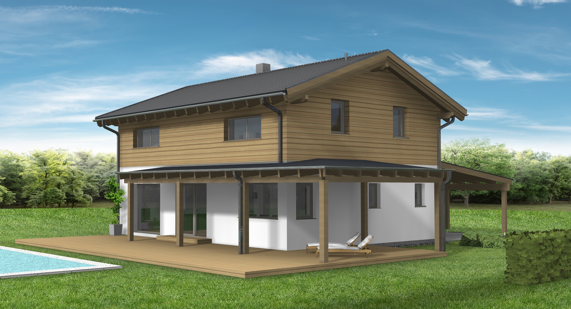 erstelle f r exakt dieses haus eine realistische au enansicht dach anthrazit fassade wei fenster und haust re hellgrau das haus soll in einem dezent modernen garten situiert sein behalte alle ma e und farben des hauses exakt bei