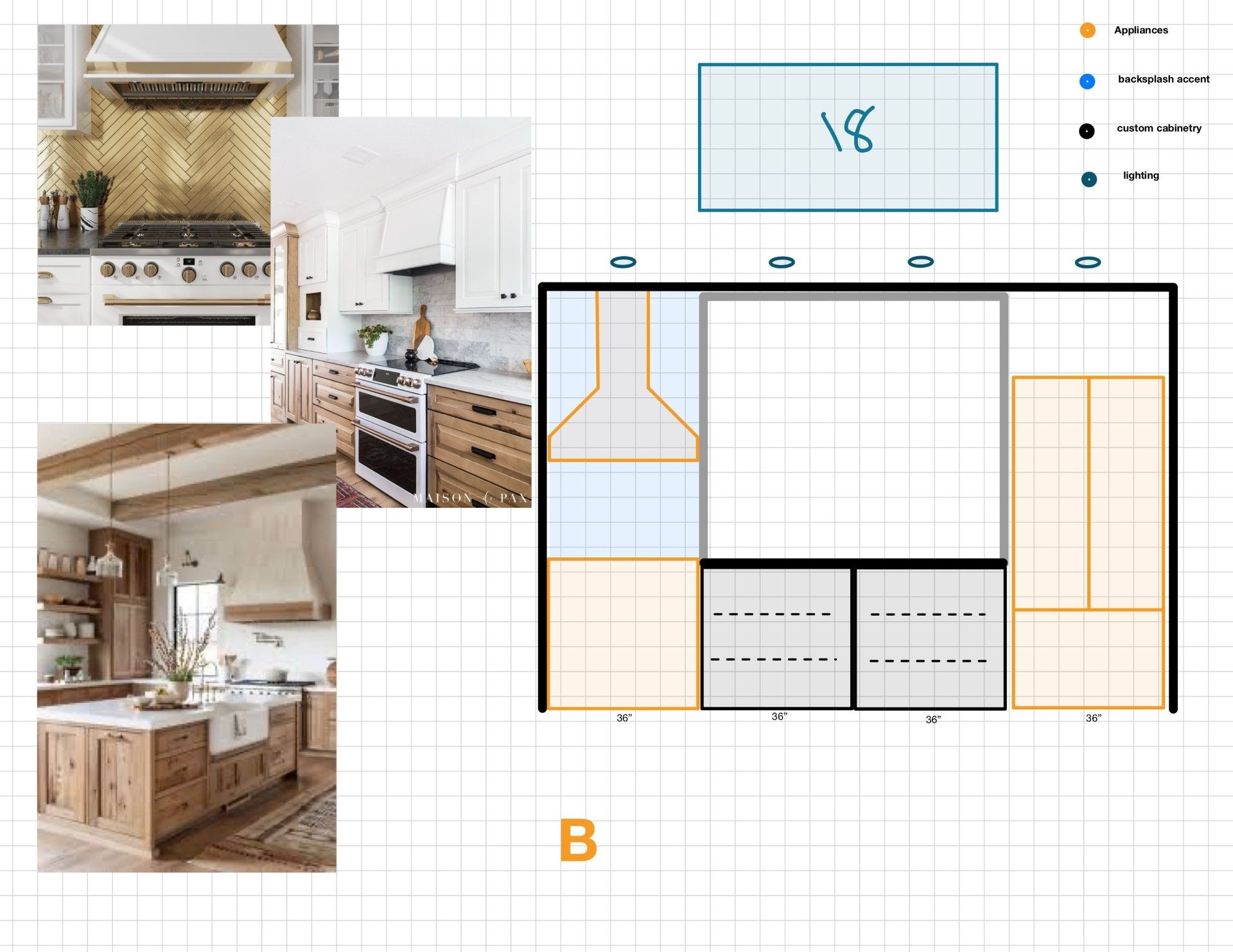 use this sketch to generate a kitchen wall rendering use a white gas range on the left and a white refrigerator on the right with gold trim accents the large opening in the wall opens into a dining room full tile up the left wide where the white range hood is light stain grade cabinets underneath the opening with full pull out drawers white quartz countertop surface extending through the opening