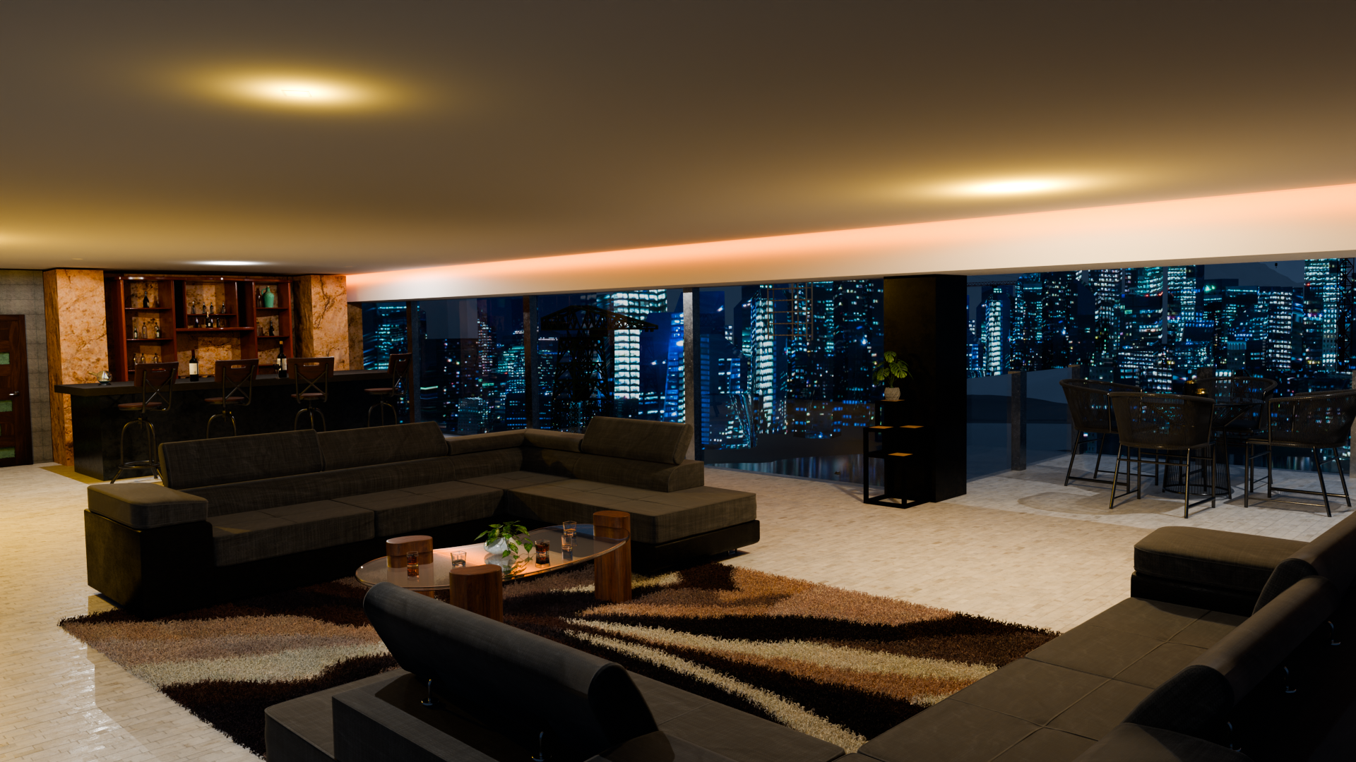 minimalism interior shot penthouse suite with scenic view of night city architecture