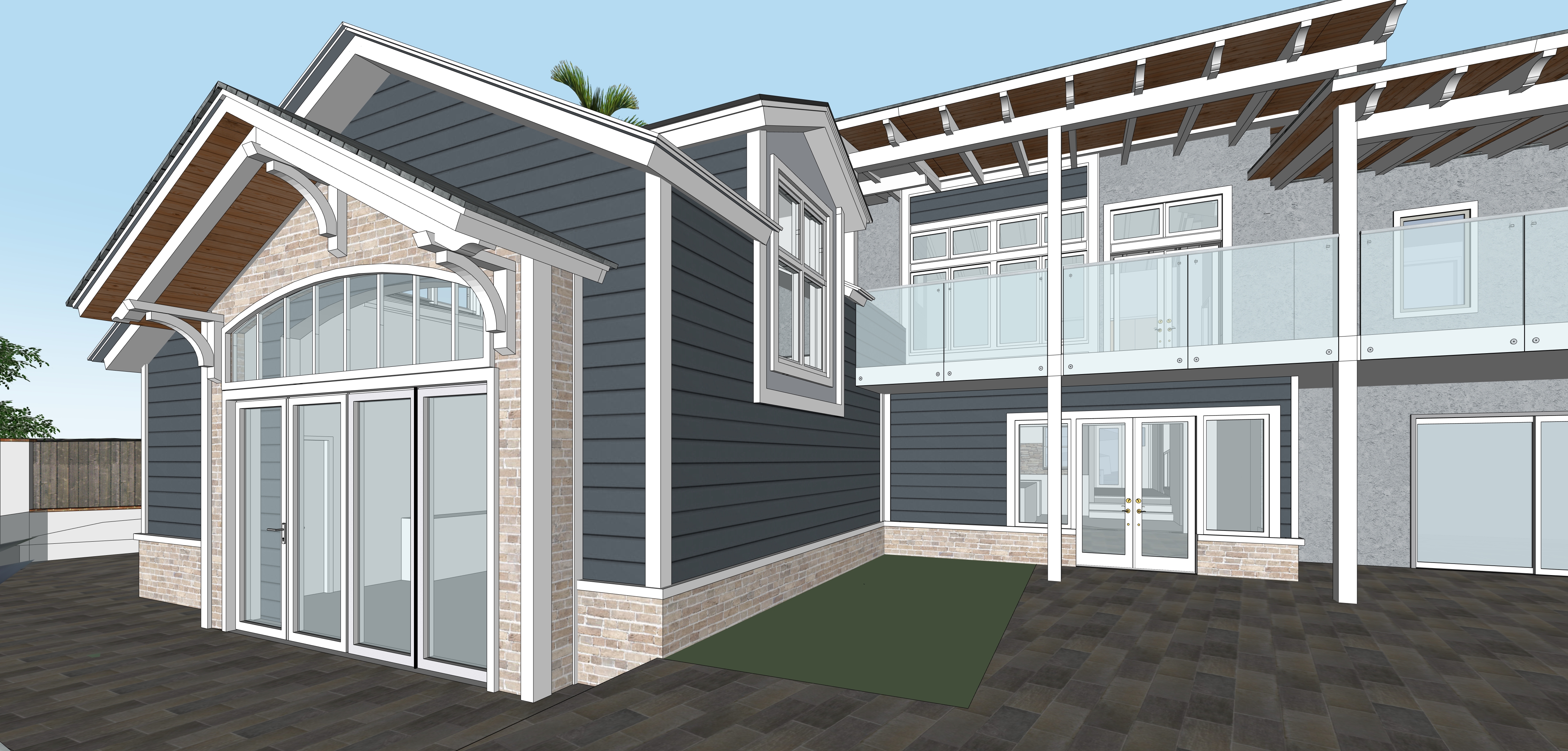 patio steps down with furniture minimalist drought tolderant landscaping golden hour