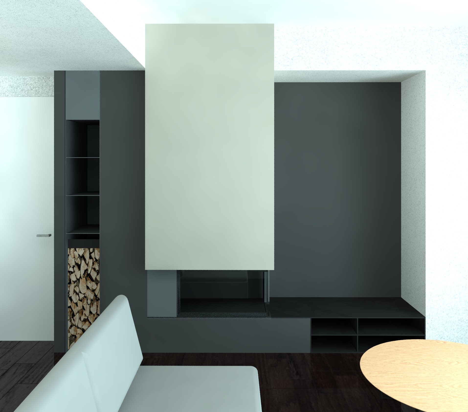 strict photorealistic enhancement preserve 100 original geometry volumes proportions edges alignments perspective and camera position do not redesign or reinterpret architecture maintain clear separation between materials ensure material and lighting consistency across all views natural soft daylight diffused and balanced exposure neutral warm white balance 4600 4800k realistic global illumination soft shadows no overexposed windows fireplace glow only inside firebox with subtle warm spill hungarian herringbone oak parquet floor dark natural oak tone matte finish visible grain low reflectivity subtle plank variation dark wall and fireplace base in lead grey plaster matte slightly textured deep uniform tone clearly darker than upper volume light walls and ceiling in fine white plaster smooth matte diffuse light behavior fireplace upper suspended volume in textured taupe plaster warm grey tone matte clearly distinct from dark wall and base fireplace frame in black matte iron with subtle micro reflections glass transparent with realistic refraction and soft reflections only realistic stacked firewood logs with varied diameters irregular cuts visible bark texture natural cracks color variation from light beige to warm brown visible end grain small shadow gaps between logs high texture detail no repetitive pattern strong depth and contact shadows minimal styling on shelf 3 4 neutral hardcover books beige grey tones one matte ceramic vase one minimal wooden box balanced spacing no clutter high resolution textures physically accurate materials ambient occlusion enabled realistic contact shadows low noise no stylization no material merging