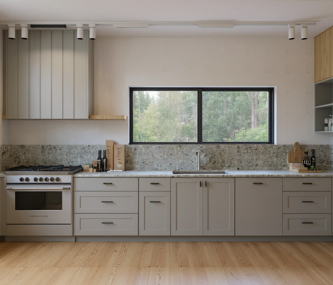 this is the back of a house with grey vertical siding and a black metal roof the foundation wall around the house and the porch has dark stone add light fixtures to the porch wall the house sits on a grass lot with a sunset and trees in the background the sun hits the front of the house add a big stone path from the stairs of the porch add a road in the background