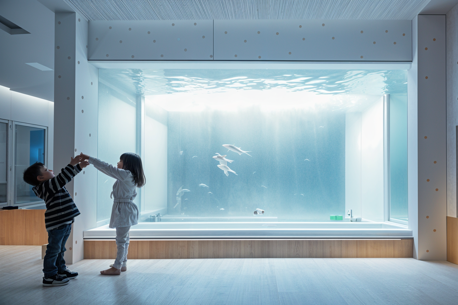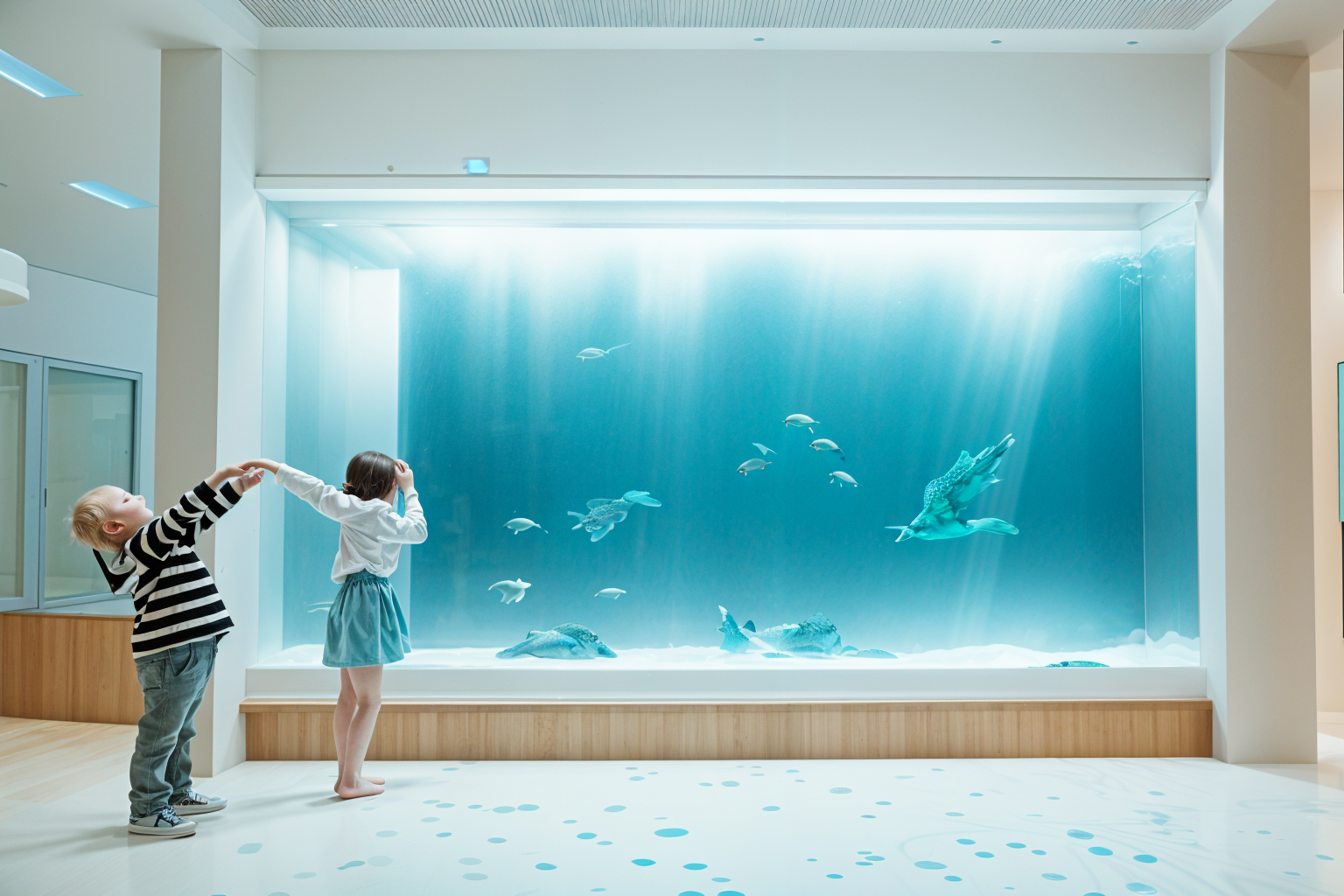 nordic interior shot this is an interior shot for a teen waiting area that resembles a mermaid lagoon large bench seating and rock cut wall with fish tank in background girl is holding a small light ball people should be more realistic back wall should be made of wood this should be set in the interior of a hospital people should look realistic people are wearing regular clothes sitting on bench architecture