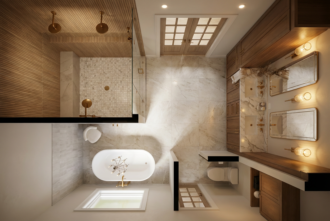 change the camera from a top down aerial view to a streaight on eye level perspective of the bathroom position the camera facing the vanity and tub area at a natural human eye height maintain the exact layout structure and placement of all elements do not move or alter any walls doors or fixtures keep all materials lighting and styling the same only adjust camera angle and perspective do not modify geometry or layout in any way