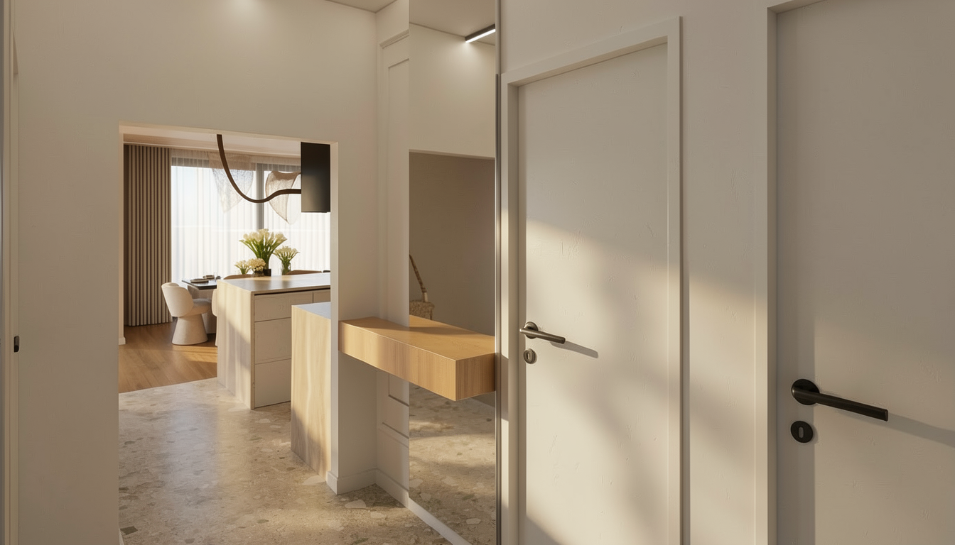 the picture is a kitchen elevation it is a u shaped kitchen and this is a picture of one wall from left to right there is a bar area that includes a full height wine cooler bar sink and counter area above is a pocket door cabinet to store spirits and alcohol next is a door to another room followed by a built in stainless steel fridge next to the fridge is a breakfast zone with an appliance garage for espresso machine and toaster the wall ends with a door to another room generate a realistic 3d rendering with a modern organic design counter tops should be a beige quartz with some brown veining and floors a white oak engineered hardwood the cabinets should be a medium brown wood color