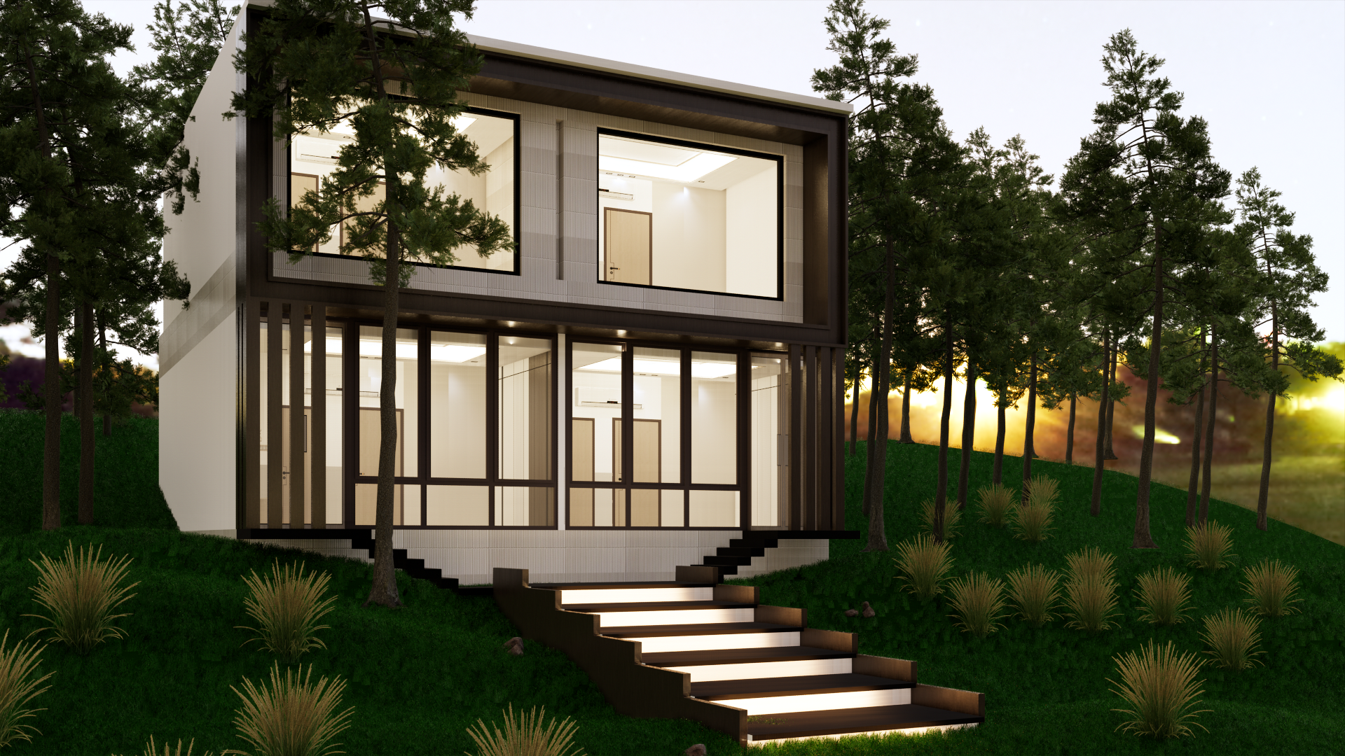 zaha hadid exterior shot there should be n swimming pool just the trees around the villa so not change anything the villa architecture