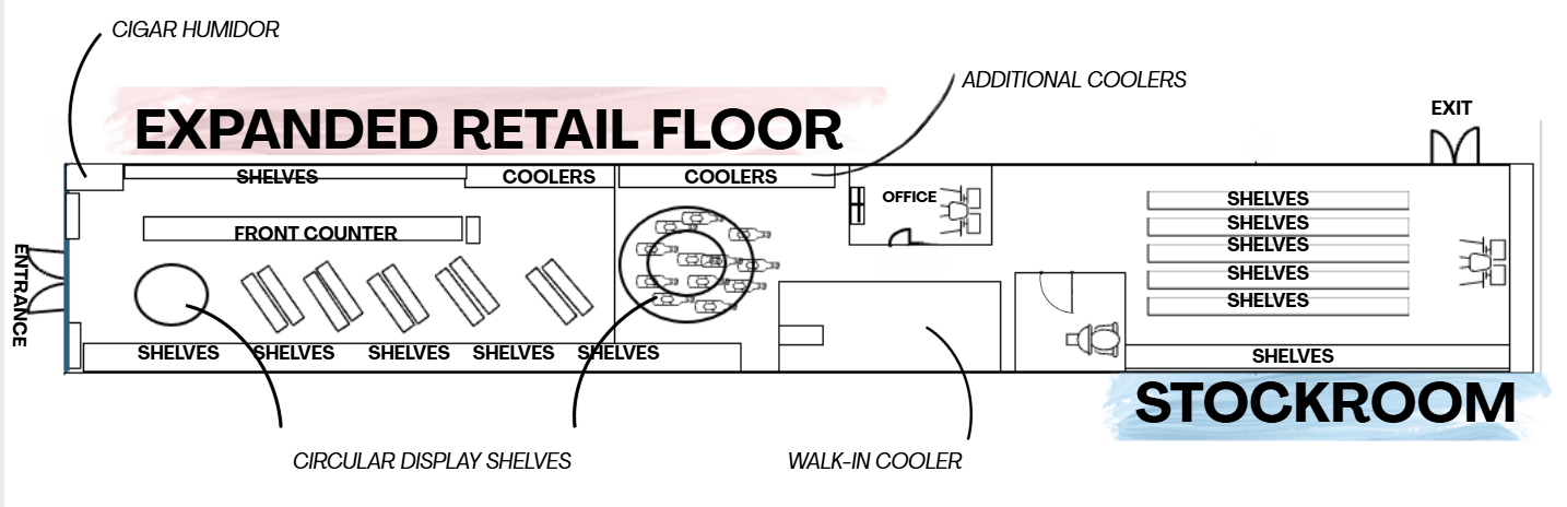 convert this floor plan into a realistic isometric 3d view of a full house show the space from an elevated angle with furniture walls and details visible liquor store use the same furniture as shows on the plan do not change the orientation of the floorplan